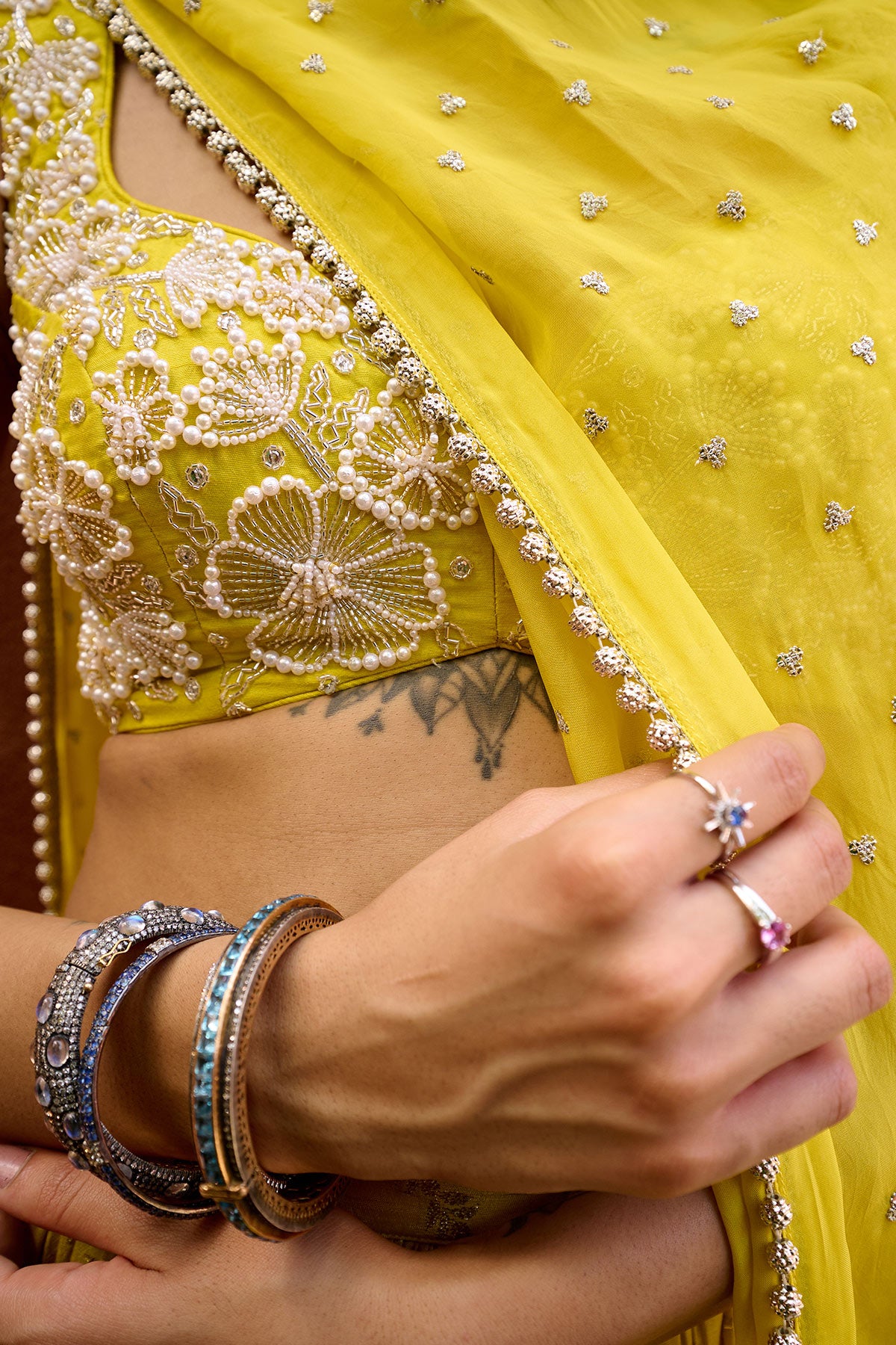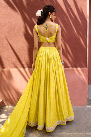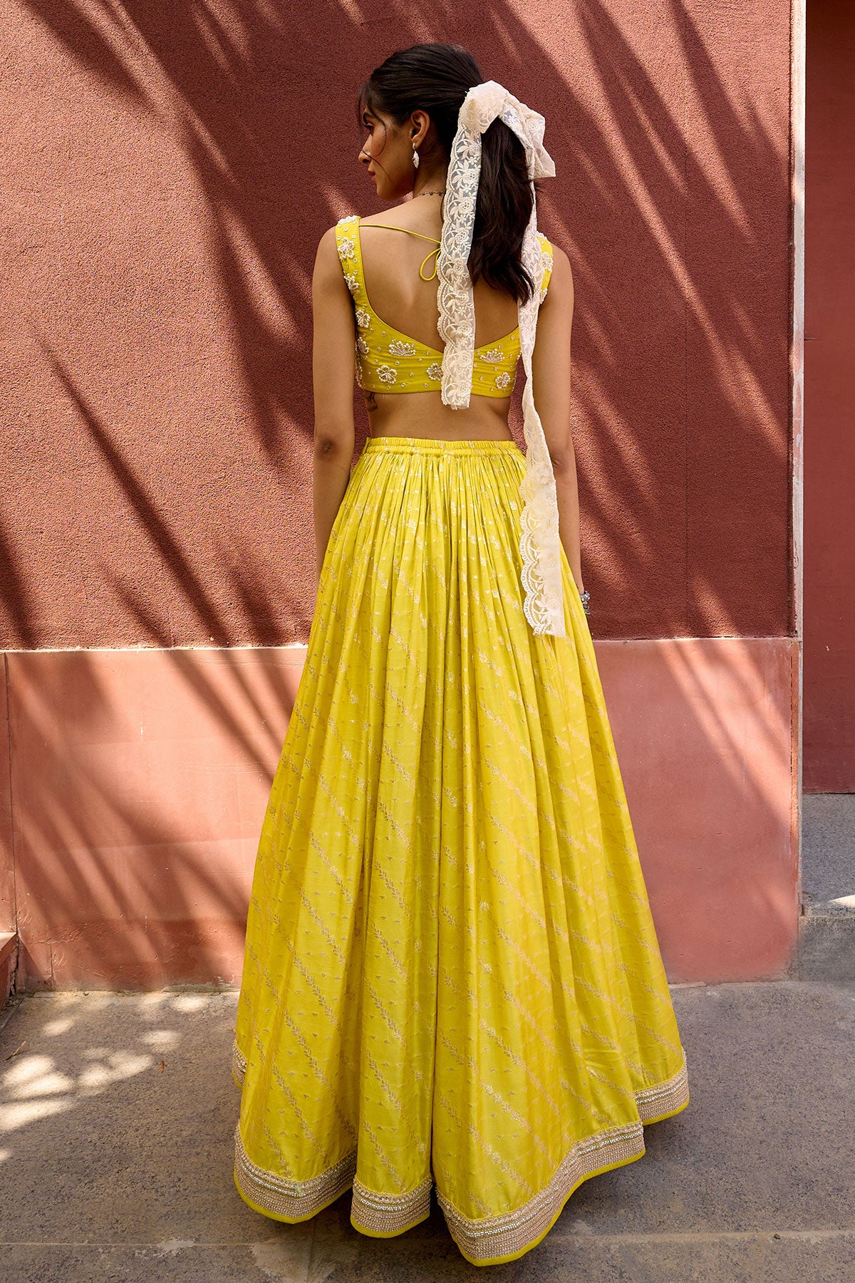 Yellow jamewar ruched lehenga paired with pearl and glass beads embroidered raw silk blouse and organza dupatta with fine sequence details
