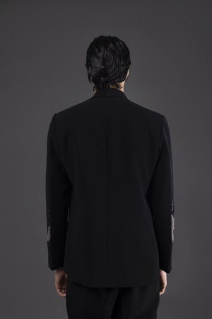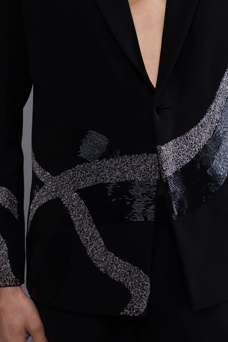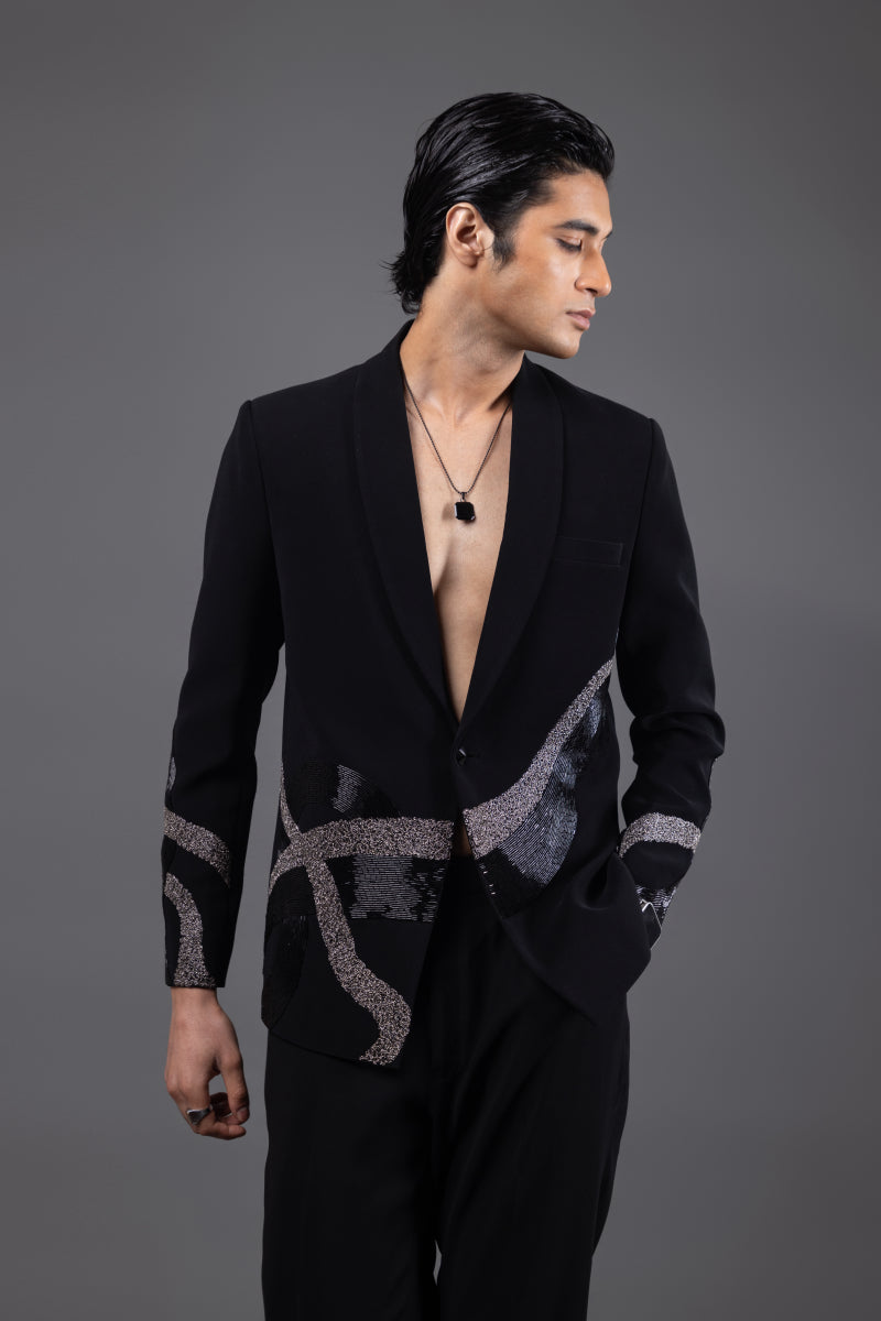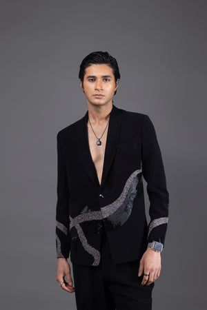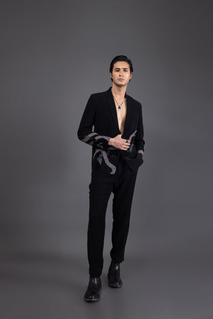 A fearless reinterpretation of classic suiting, this deep black tuxedo comes with fierce, serpentine dragon embroidery winding across the sleeves and torso. Designed for those who command attention without saying a word. Crafted in luxe suiting fabric with a razor-sharp silhouette and open neckline, it’s perfect for cocktail nights, afterparties, and red carpet moments.