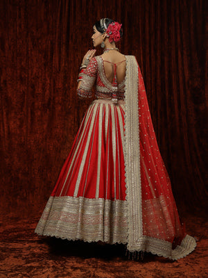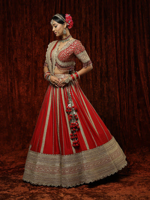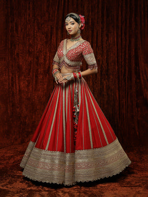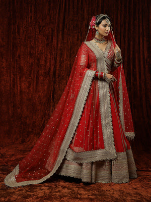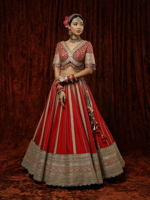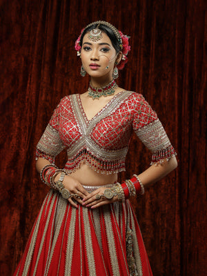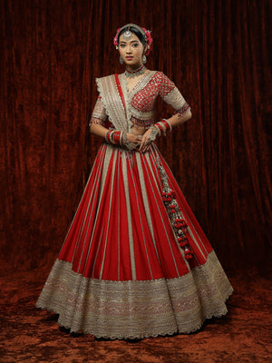 This beautiful lehenga is inspired by the style of the maharanis of the Royal court. This Red colored lehenga has a 12 inch border with fine gota, dori and badla work. This fine heritage inspired piece is accompanied by a choli blouse with all over gota work, zari embroidery. This lehenga has a net dupatta. This entire ensemble is exquisite in itself because of its color and the beautiful embroidery.