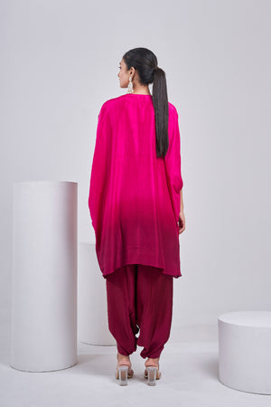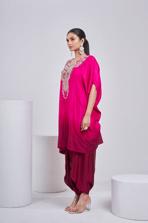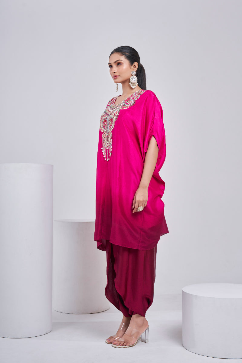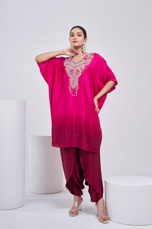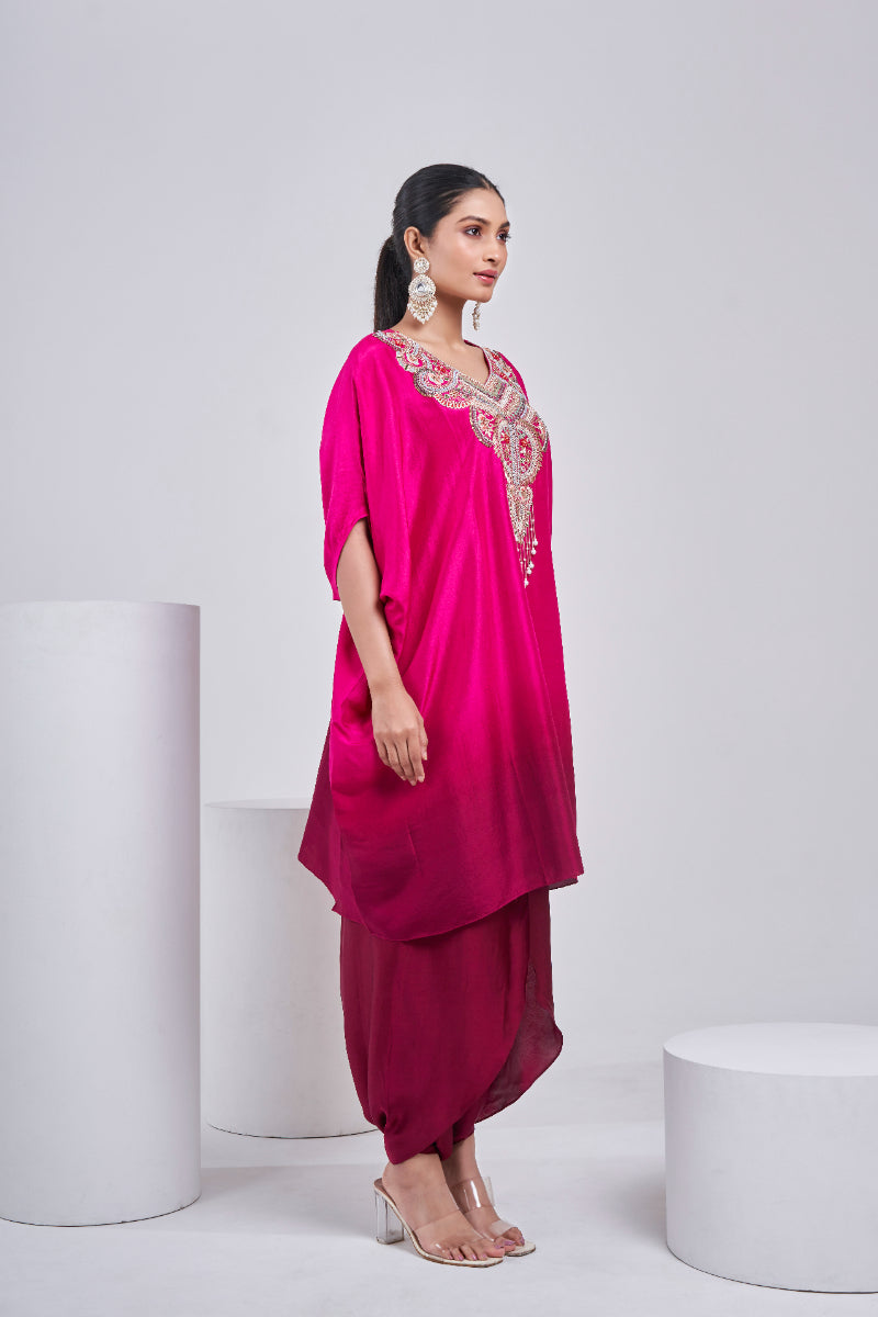 Bold, intoxicating, and unapologetically regal—the Rose Noir kaftan set is crafted in an ombré gradient of deep fuchsia to berry wine, echoing the richness of a blooming midnight rose. The fluid silhouette features our signature kaftan drape paired with soft tulip pants, while embroidery cascades down the neckline like vintage heirloom jewellery. Designed for the woman who owns every room she walks into—fiery, fearless, and forever in bloom.