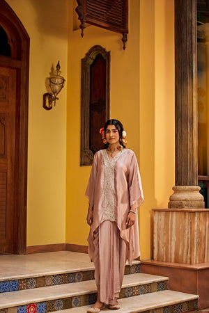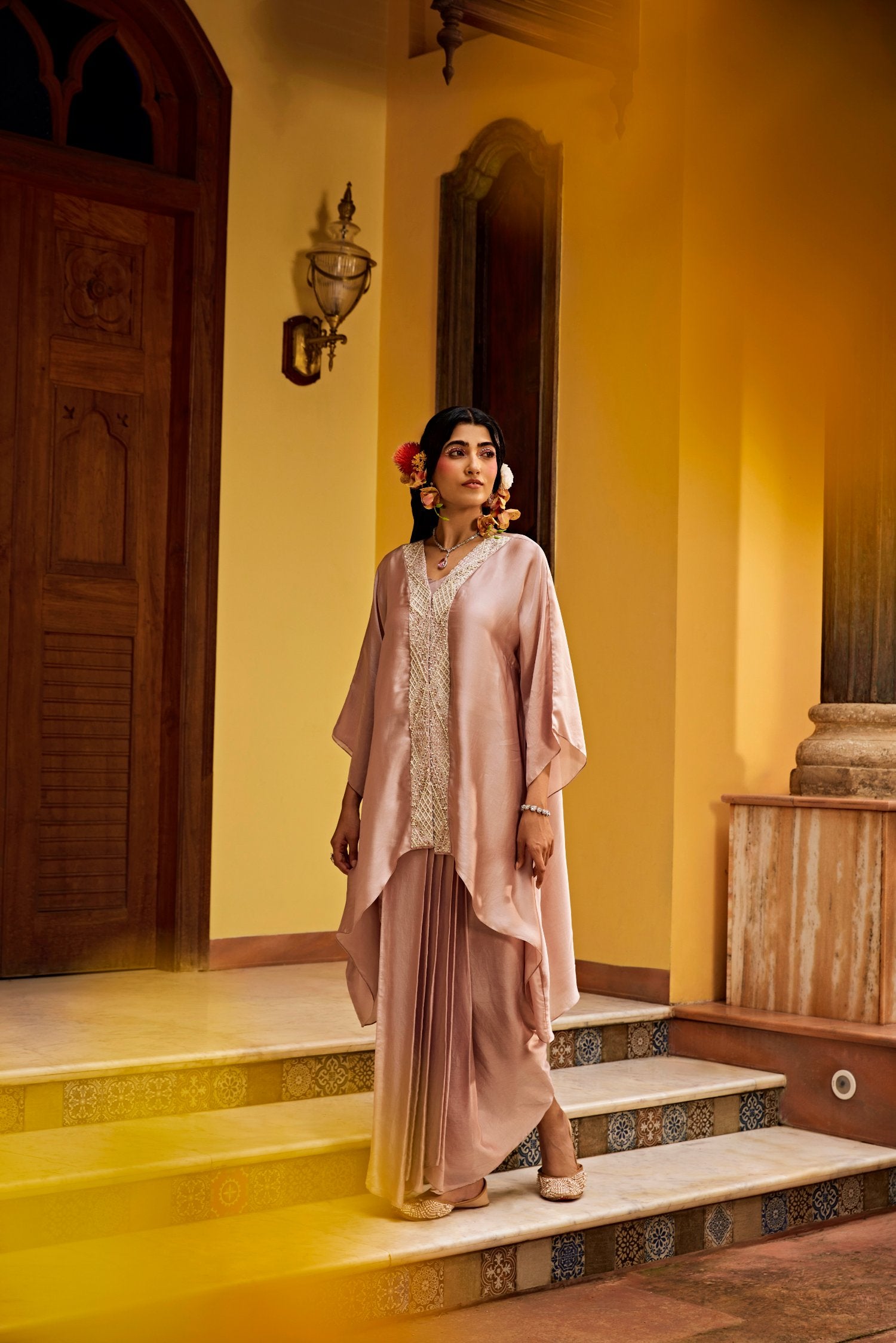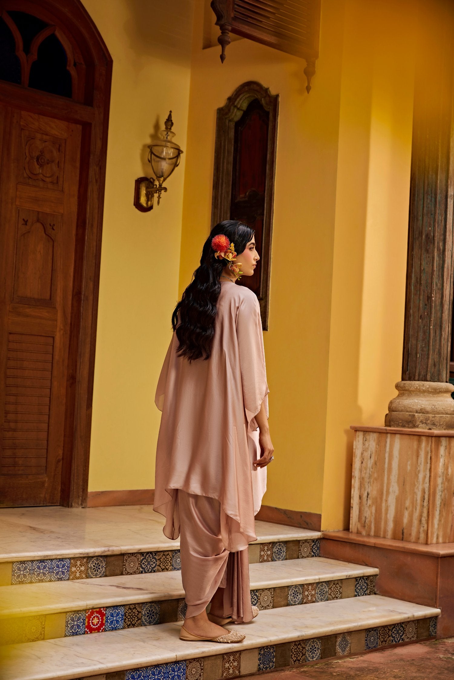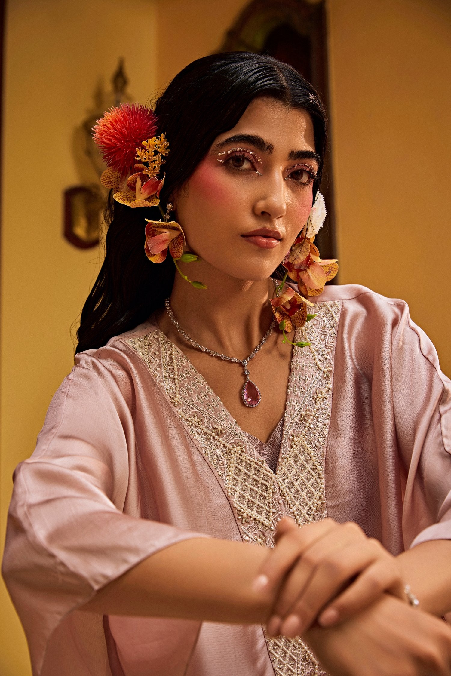 Our light rose pink modal satin pleated skirt is perfectly paired with a satin organza asymmetrical short jacket. The jacket is adorned with exquisite pearl, thread, and katdana embroidery, creating a harmonious blend of tradition and modernity. This ensemble is ideal for upscale events, cocktail parties, and sophisticated gatherings. Elevate your presence with this opulent attire that exudes elegance and timeless charm. Model Info: