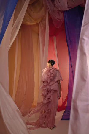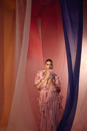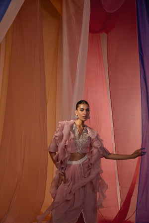 Rose Pink Ruffle Cape With Embroidered Neck Detail Blouse And Drape Scallop Skirt