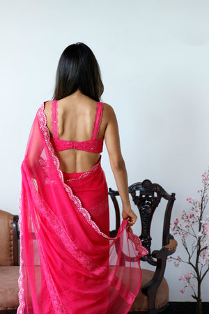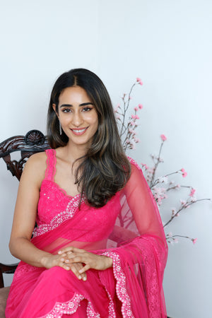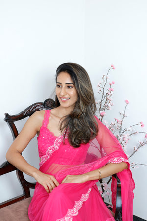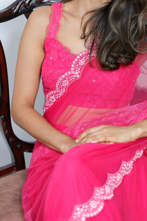 Rose Pink Pre Draped Saree With Layered Chantilly Lace And Pearl Border And Embroidered Blouse
