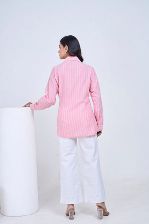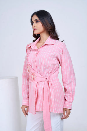 A blush pink striped wrap shirt with floral applique detailing — soft, tailored, and romantic. Featuring a side tie that accentuates the waist and elevates the everyday shirt into something charmingly feminine. Style it with whites or denims for a soft summer statement.