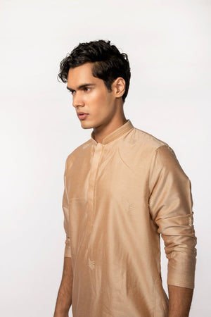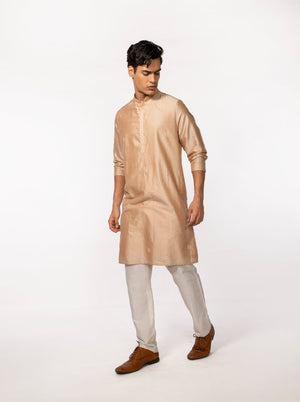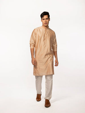 Rosegold kurta with subtle embroidery is complimented with a pair of pant pajama. Kurta Length- 42''. **The color may slightly vary due to screen lighting.