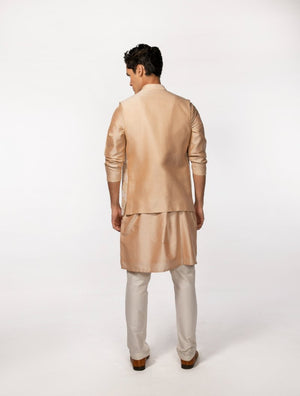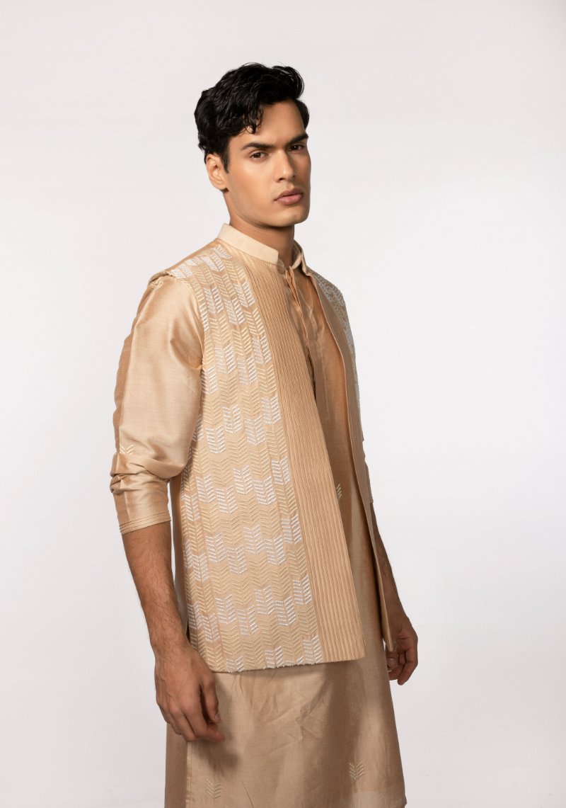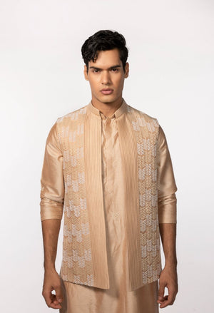 Rosegold open bundi with heavy embroidery, complimenting with pintuck detailing. Bundi length is 29". **The color may slightly vary due to screen lighting.