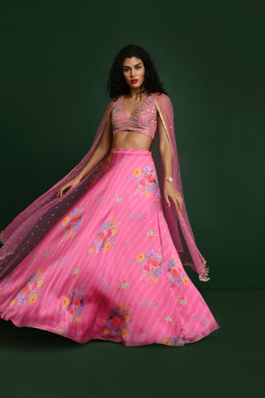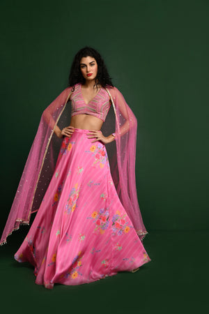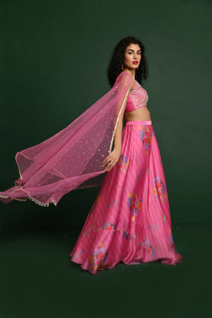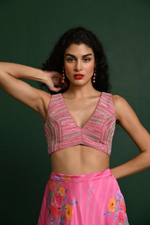 Sequins And Glassbead Emroidered Blouse Paired With Floral Satin Printed Semicircle Skirt And Tulle Dupatta