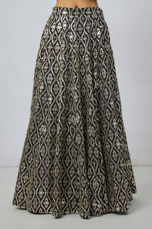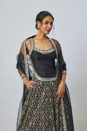 Featuring blouse with intricate embroidery along the neckline and straps. Paired with it is a voluminous lehenga adorned with mirror work and geometric patterns, creating a striking visual impact. The look is completed with a net dupatta, subtly embellished with accents for a graceful touch.