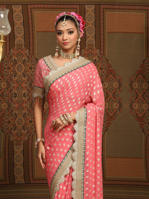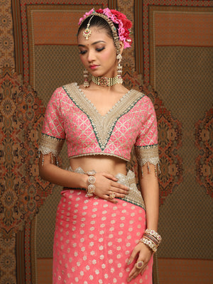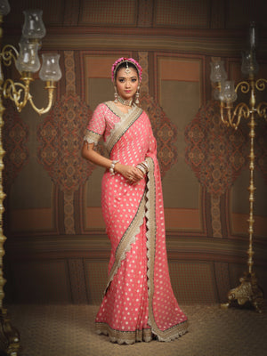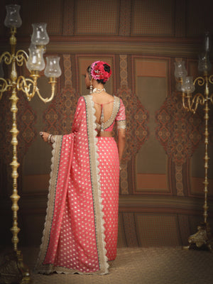 Embrace a burst of vibrancy with our Rouge pink and Emerald Green Georgette Saree, embellished with intricate Gota, Dori and Badla work. The saree’s electrifying hues create a captivating contrast, highlighting the fusion of tradition and modernity. Complementing this masterpiece is a silk chanderi blouse, featuring a scalloping V neckline that exudes charm and elegance.