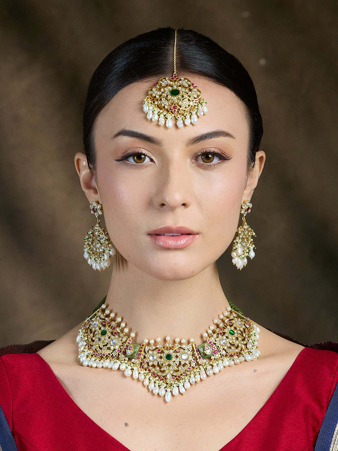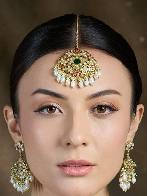 Elevate your traditional attire with the Royal Bloom Kundan Maang Tikka, featuring a floral design, rich pink and green stones, and pearl danglings—perfect for bridal elegance and festive radiance.
