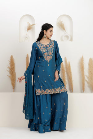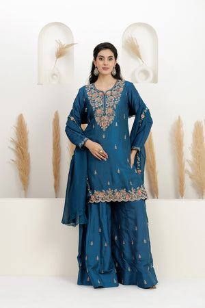 Royal Blue Pure Bamber Silk Embroidered Sharara Set