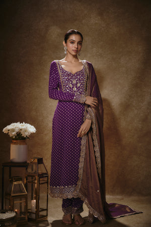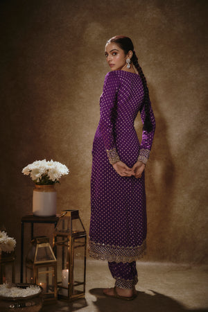This Look Features A Royal Purple Benarasi Kurta Pants Set. The Set Comprises Of Machine Embroidered Gota, Sequin, Cutdana And Mirror Embroidery. The Kurta Has Embroidered Yoke & Sleeves. It Is Teamed With Benarasi Pants Embroidered At Hem. A Shimmer Tissue Dupatta With Matching Border Completes The Look.