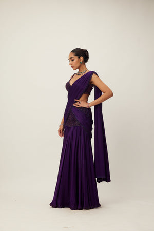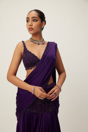 Royalty Purple Pre Draped Crystal beaded Saree Set