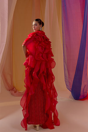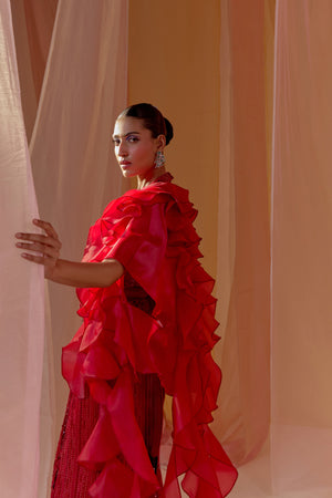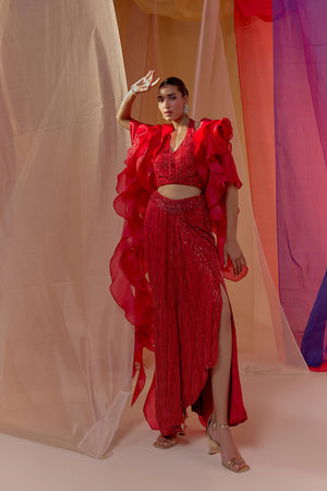 Ruby Red Fully Embroidered Halter Blouse With Drape Skirt And Ruffle Organza Cape