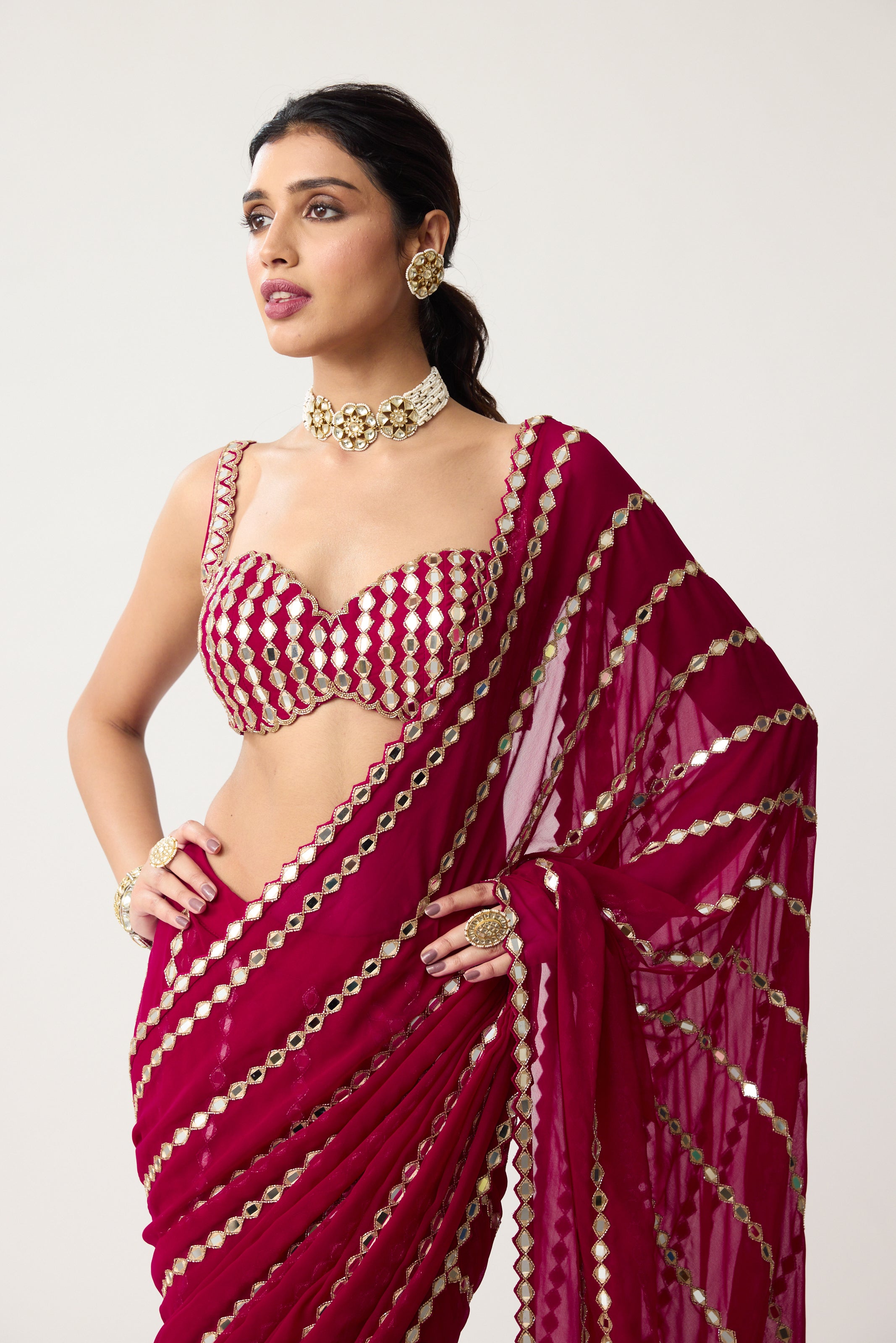 Ruby red Linear Mirror hand embroidered Georgette Saree clubbed with real hand cut mirror embroidered sleeveless blouse