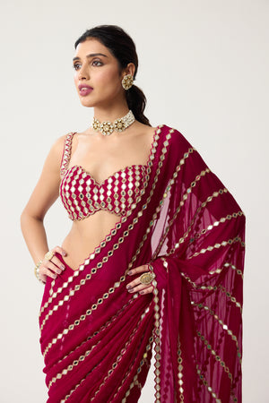 Ruby red Linear Mirror Saree Set