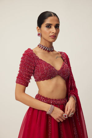 Intricately hand embroidered Lehenga And Dupatta featuring sequins, cutdana and crystal embroidery clubbed With jewelled blouse with crystal embellishments.