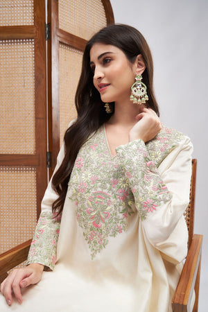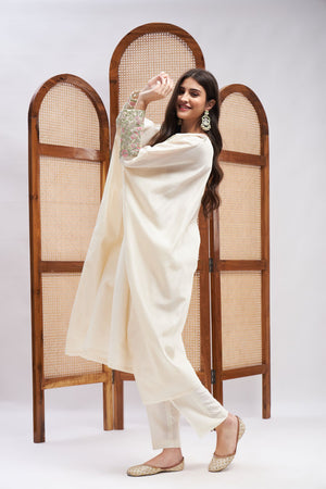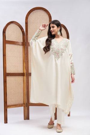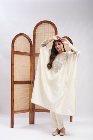 Off-white kaftan kurta and tonal pants. An off-white silk chanderi embroidered kaftan kurta set with tonal pants. The Kurta comes with resham and zari embroidery followed by complementing embroidery on the sleeves. The ensemble is constructed in fine silk and is lined with soft mulmul. The outfit is truly one of a kind.