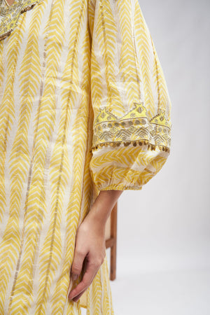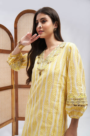 Yellow Kurta set with embroidery and matching pants. The kurta features bishop sleeves that add a dramatic and fashionable element to your outfit, ensuring that you make a stylish statement wherever you go. The V-neckline adds a hint of allure and modernity to your look, framing your neckline beautifully.