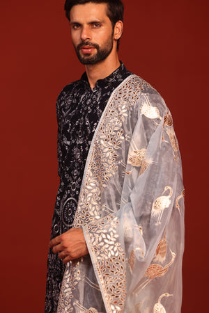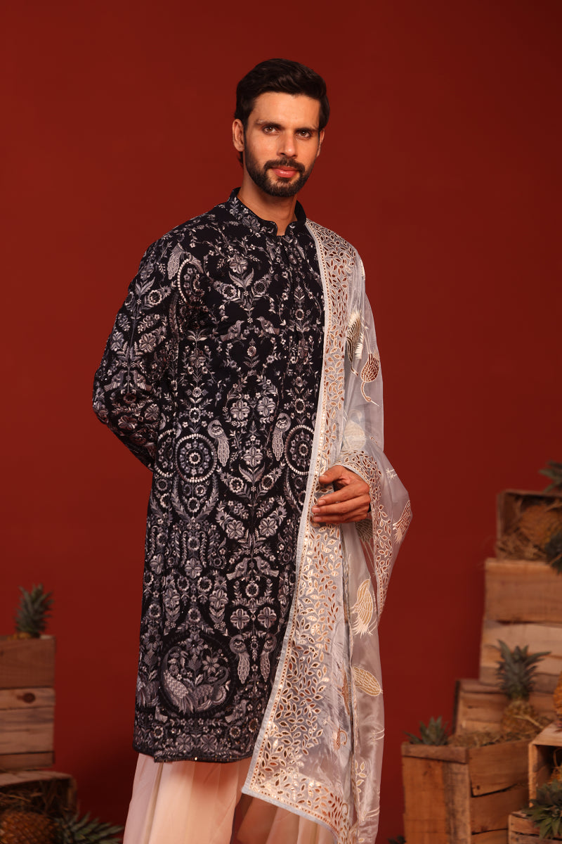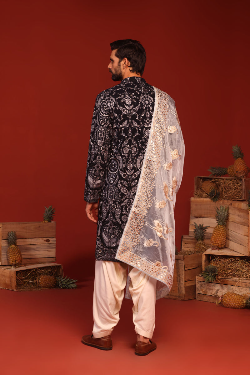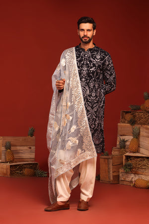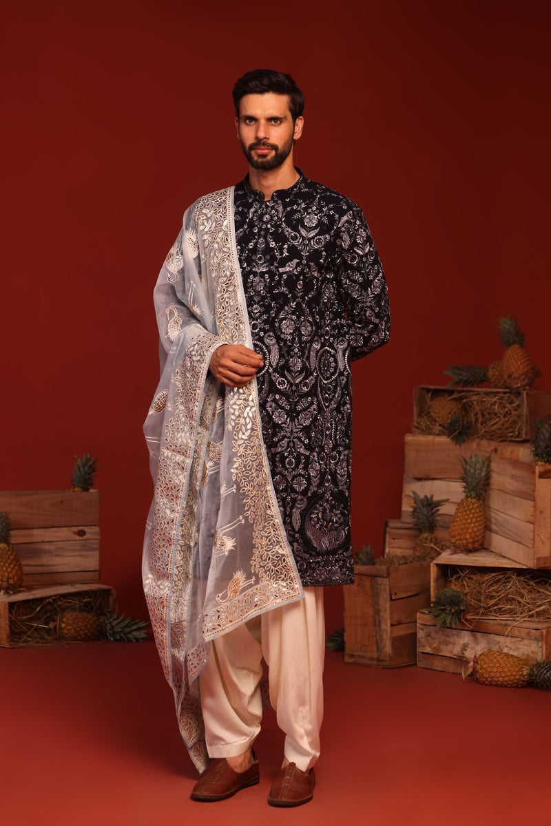 Adorned with exquisite reshom and sequinned embroidery, this kurta set includes two pockets for convenience and a pure viscose lining for comfort. The heavily embroidered dupatta adds a touch of luxury, while the ivory Patiala completes the look for a sophisticated, traditional outfit.