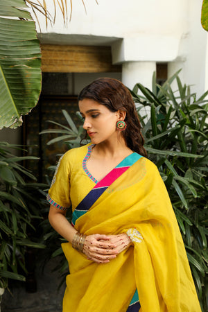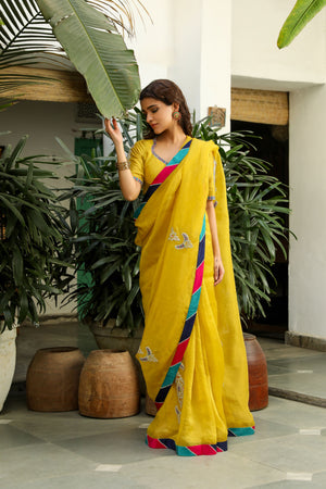 Mustard yellow embroidered saree with matching blouse fabric