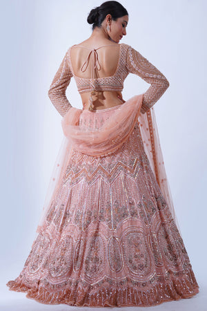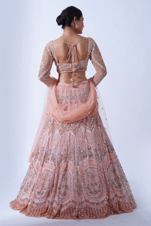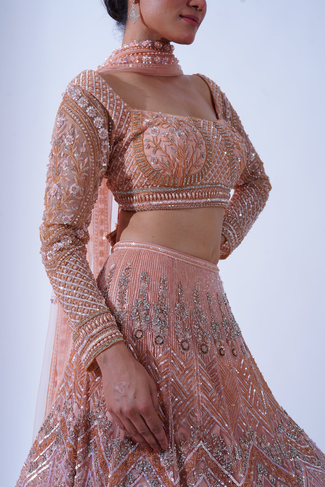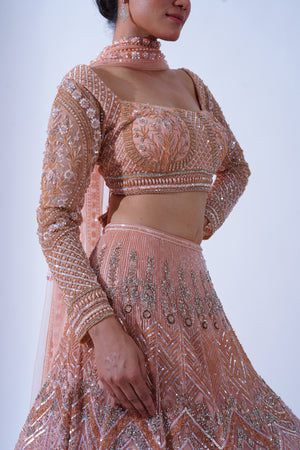 Adorn yourself in sophistication with our Peach Lehenga, meticulously hand-embroidered with pearls and crystals. The full-sleeved choli-cut blouse complements the ensemble, paired with a dupatta featuring border and buti embroidery, creating an exquisite and timeless look for your special moments.