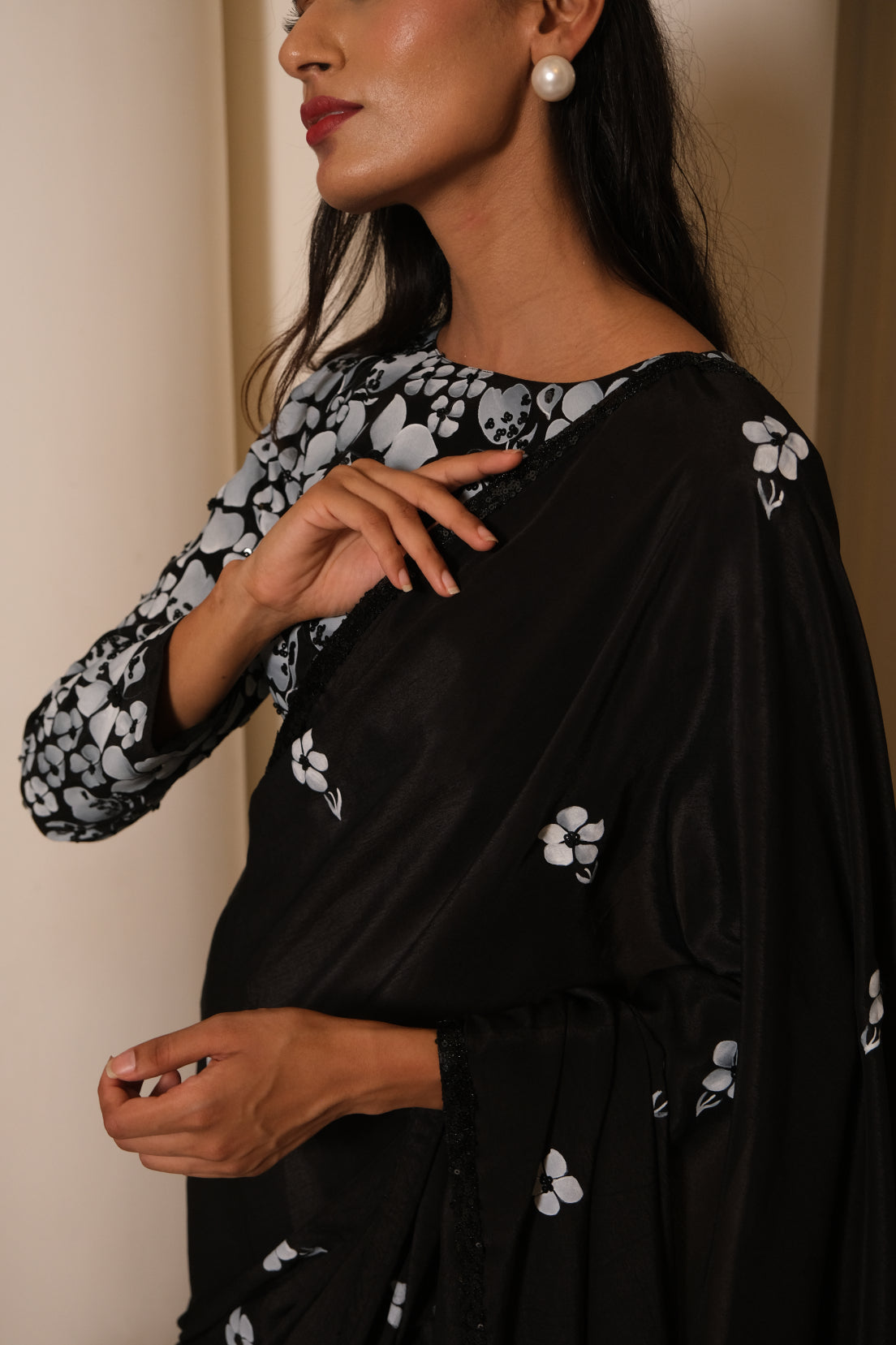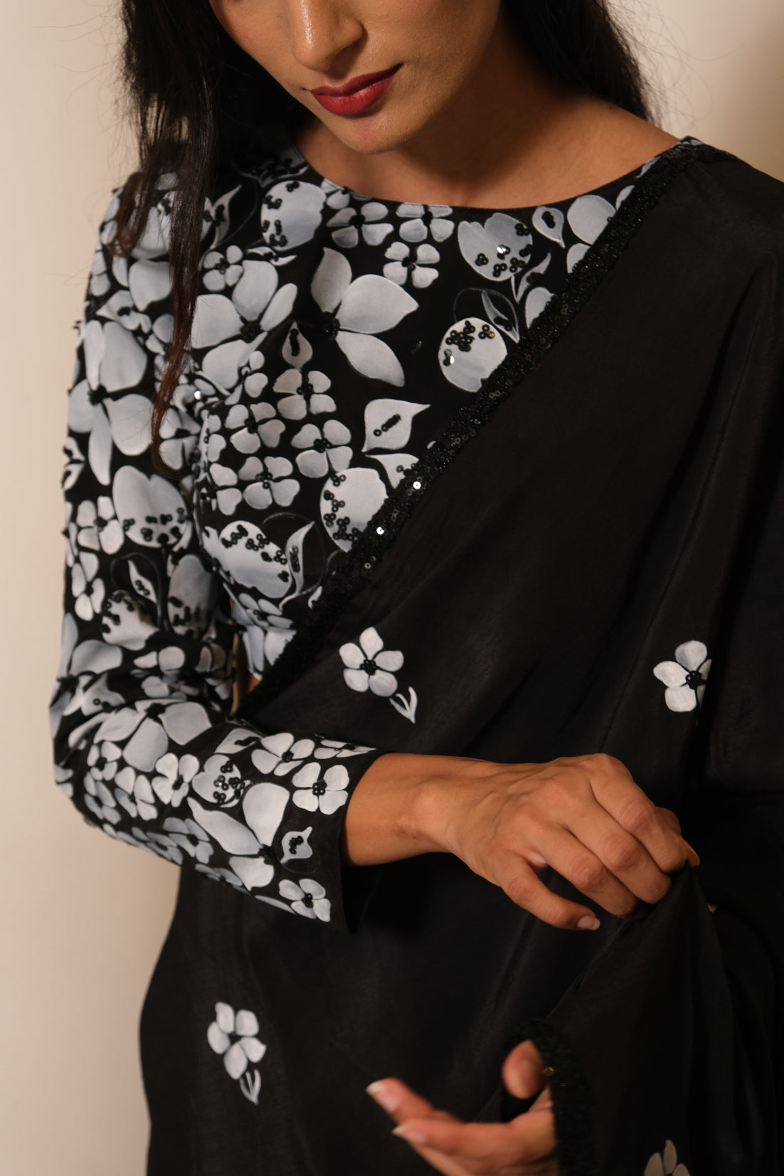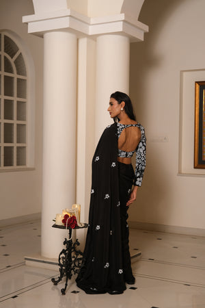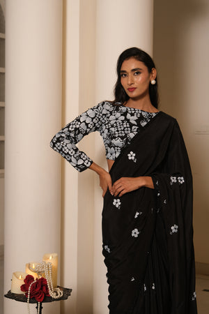 An elegant black crepe saree, delicately detailed with scattered hand-painted floral motifs and finished with a subtle sequin border. Paired with a statement blouse featuring bold hand-painted florals, it strikes the perfect balance of classic grace and modern charm.