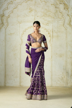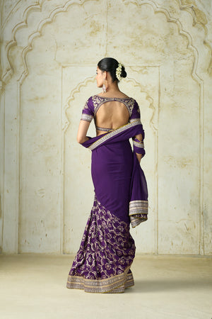 This regal saree exudes timeless elegance with its rich fabric and intricately embroidered details. The blouse is heavily embellished perfectly complementing the saree. The drape flows gracefully, showcasing a beautifully embroidered lower half with elaborate patterns that add depth and grandeur.