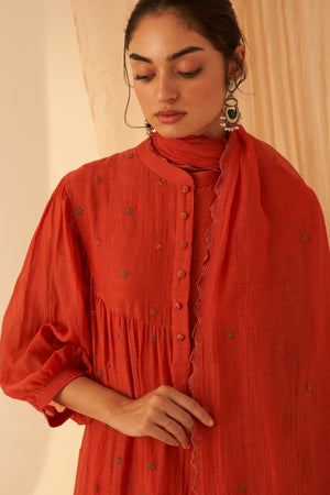 A trendy yet timeless rust Chanderi kurta, beautifully adorned with cross-stitch embroidery, paired with a cotton slip, matching pant, and a Chanderi dupatta—a perfect blend of elegance and sophistication.