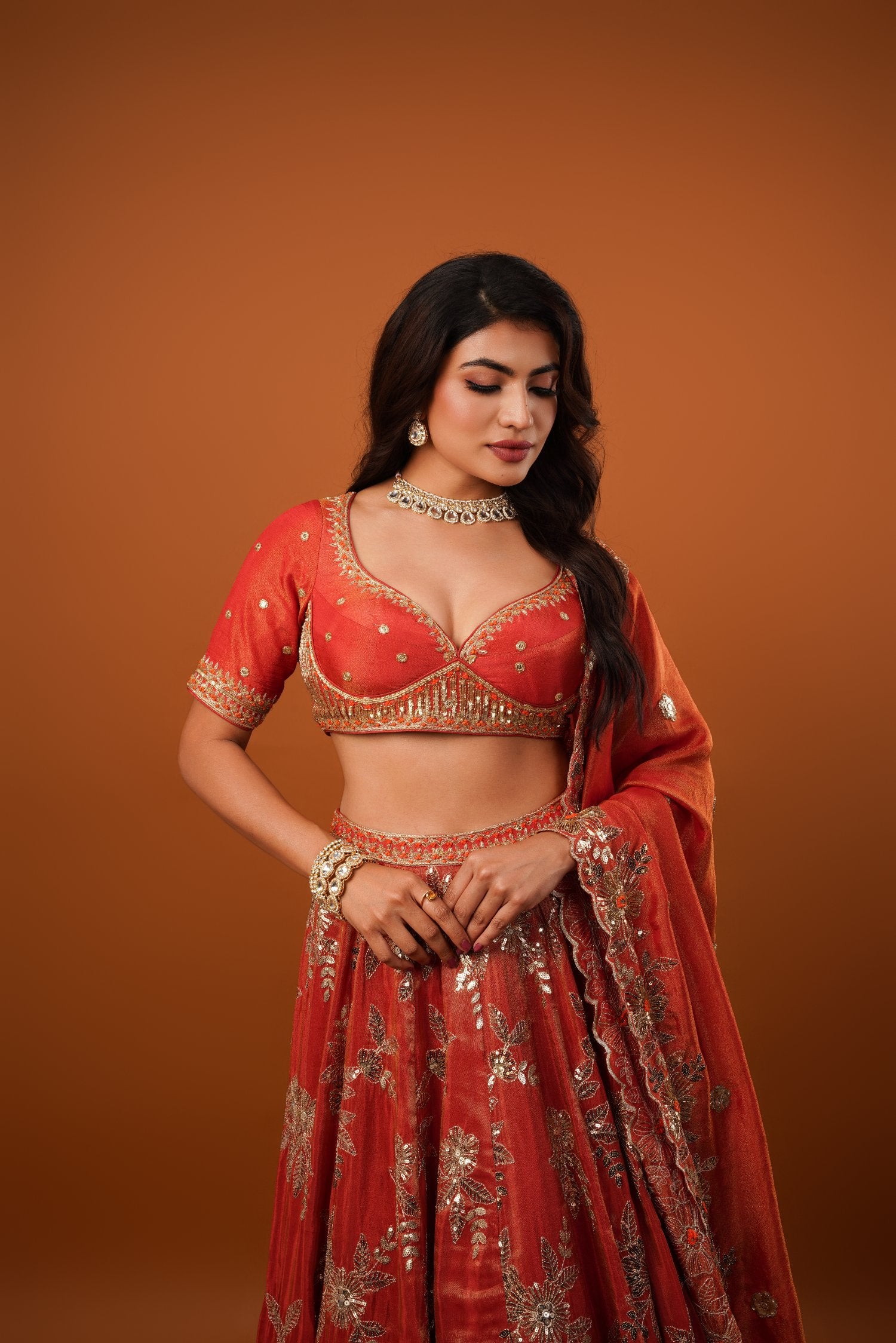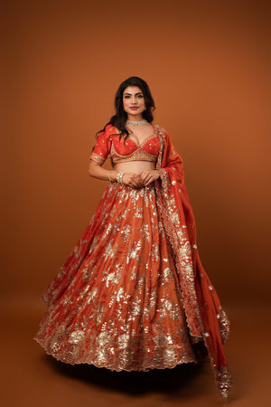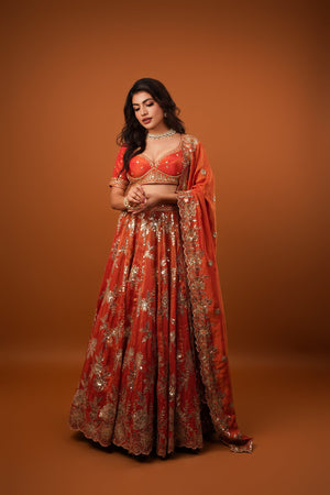 Featuring a rust gold lahenga in tissue base with seuins and hand embroidery. It is paired with embroidered blouse and dupatta . Accentuate it with statement jewellery and heels for a festive occasion or wedding ceremony.