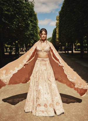 Indulge in elegance with Rust and Beige Lehenga Set, meticulously adorned with intricate handcrafted embroidery. The lehenga combines luxurious raw silk and velvet, complemented by a net and raw silk blouse. Complete your ensemble with a shimmering silk dupatta.