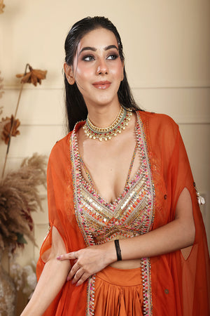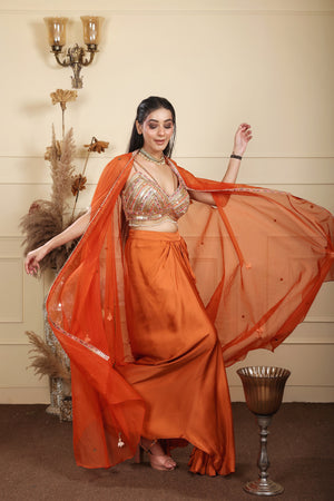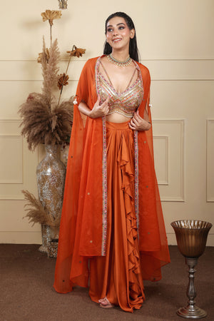 Rust orange drape skirt paired with a zari & threadwork blouse & a cape featuring seashells
