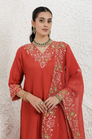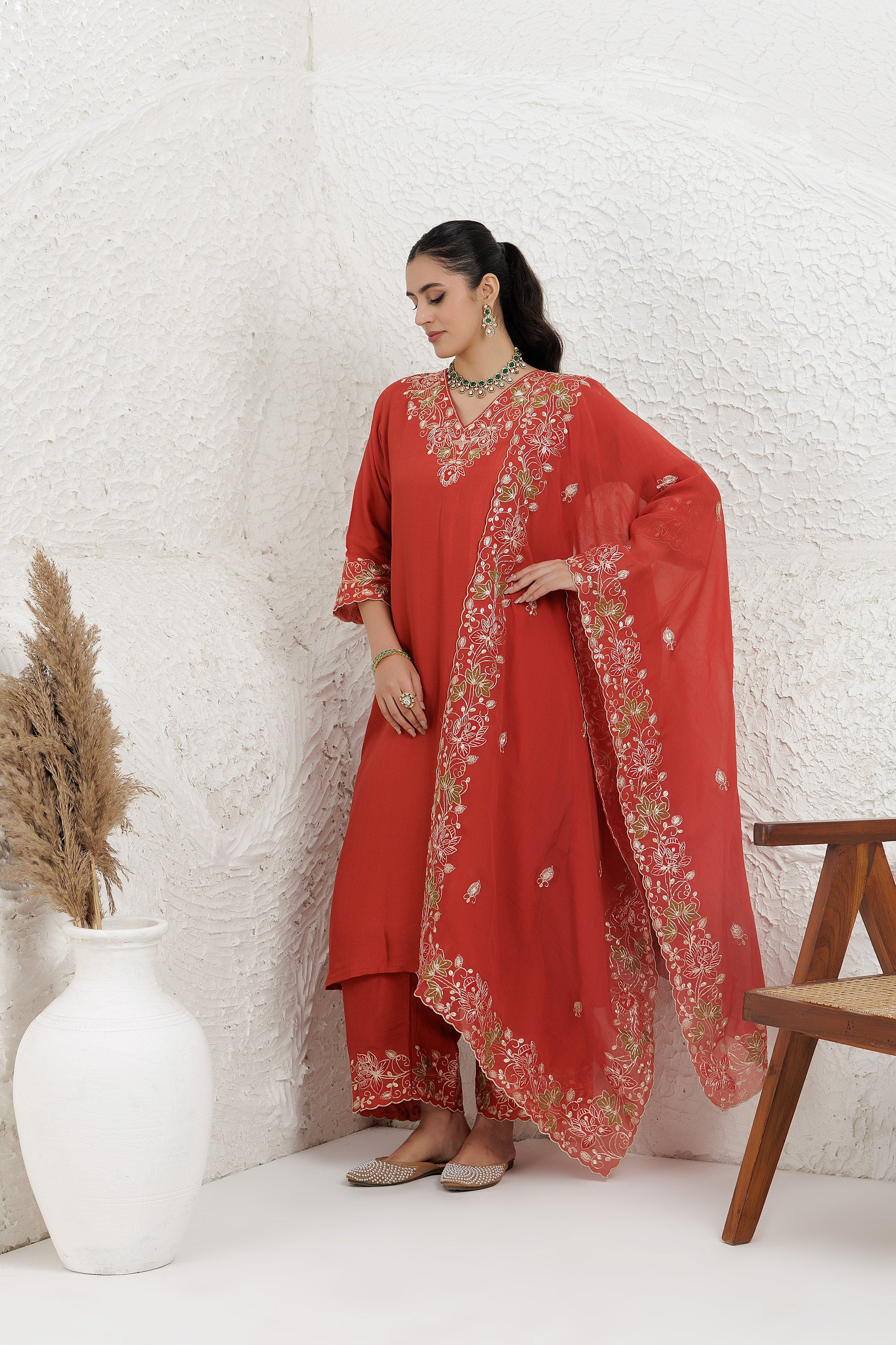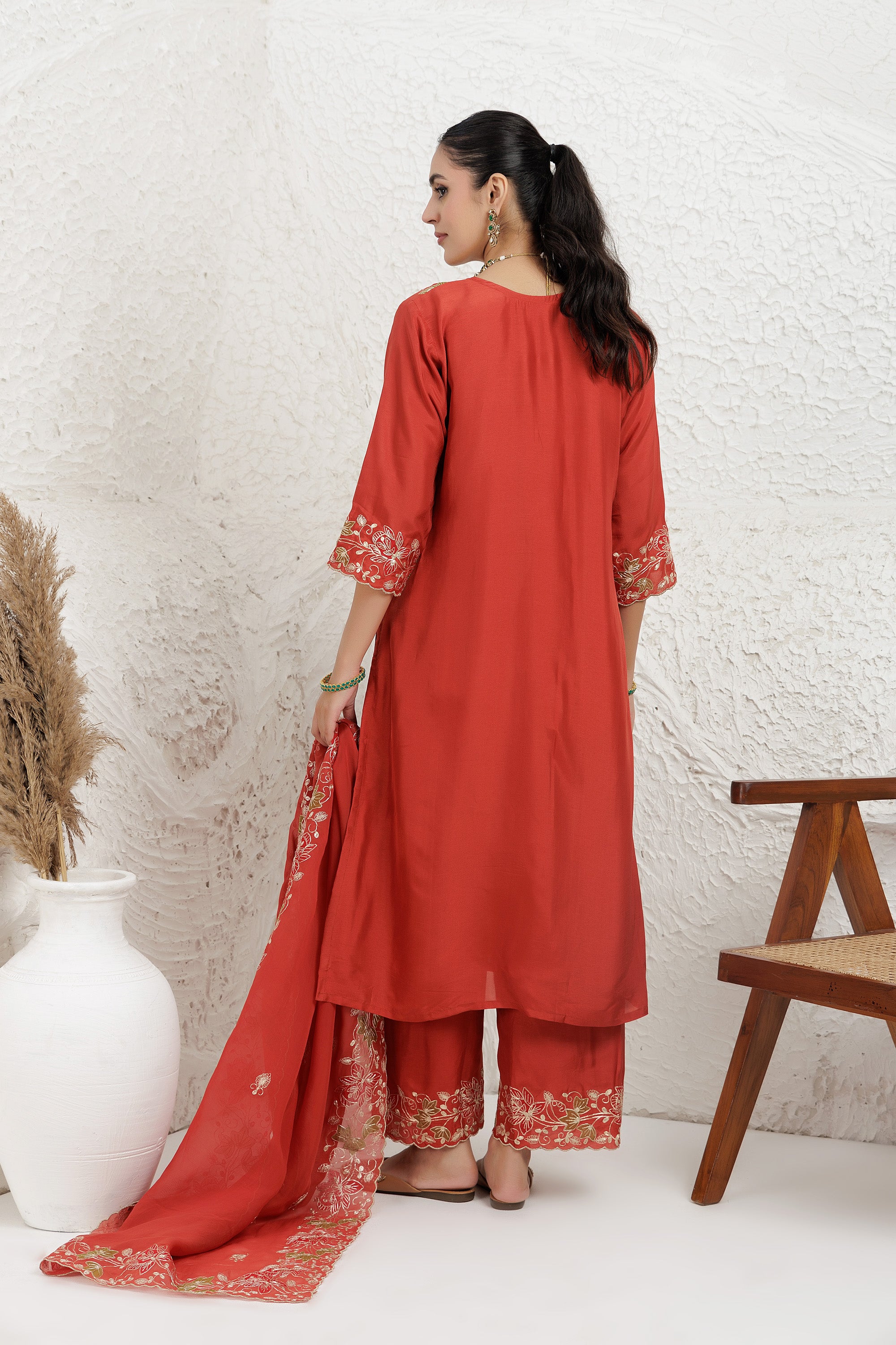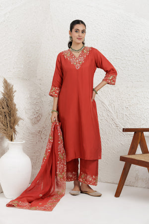 Rust straight kurta in Russian silk base with pitta and work. It is paired with pants and an organza embellished dupatta. Accentuate it with statement earrings and heels for festive ceremonies.