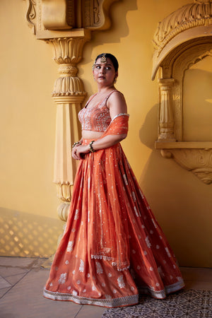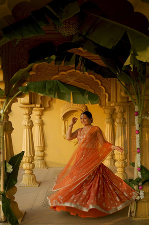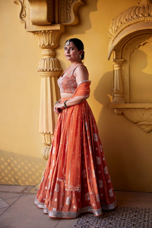 Rust Ruched Jamewar Lehenga Paired With Heavily Embroidered Cutdana, Sequence And Pearl Work Scoop Neck Raw Silk Blouse And Tulle Dupatta With Gota And Pearl Work Border
