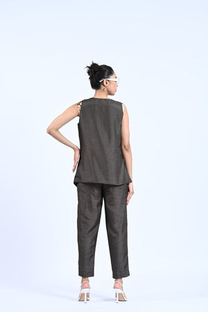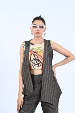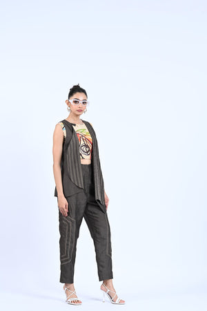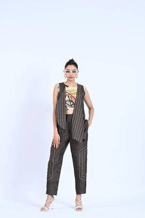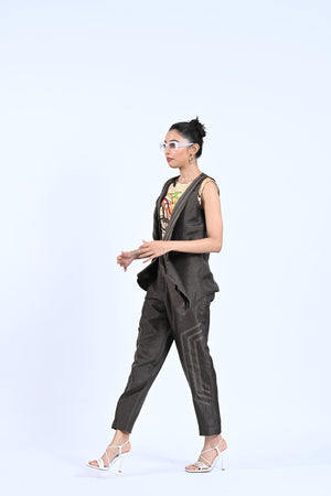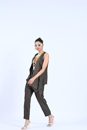 Add a touch of elegance and style to your wardrobe with our Rustic Royal set. The high-low thread detailing adds unique texture and dimension to the jacket and trousers, while the printed crop top adds a pop of color. Perfect for any occasion, this set will make you stand out in a crowd.
