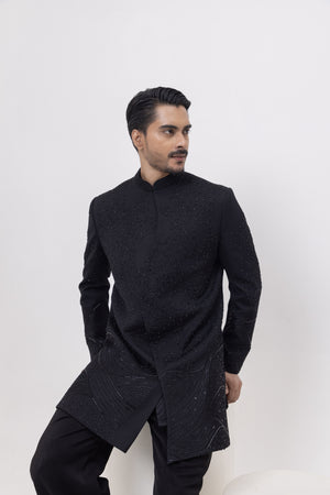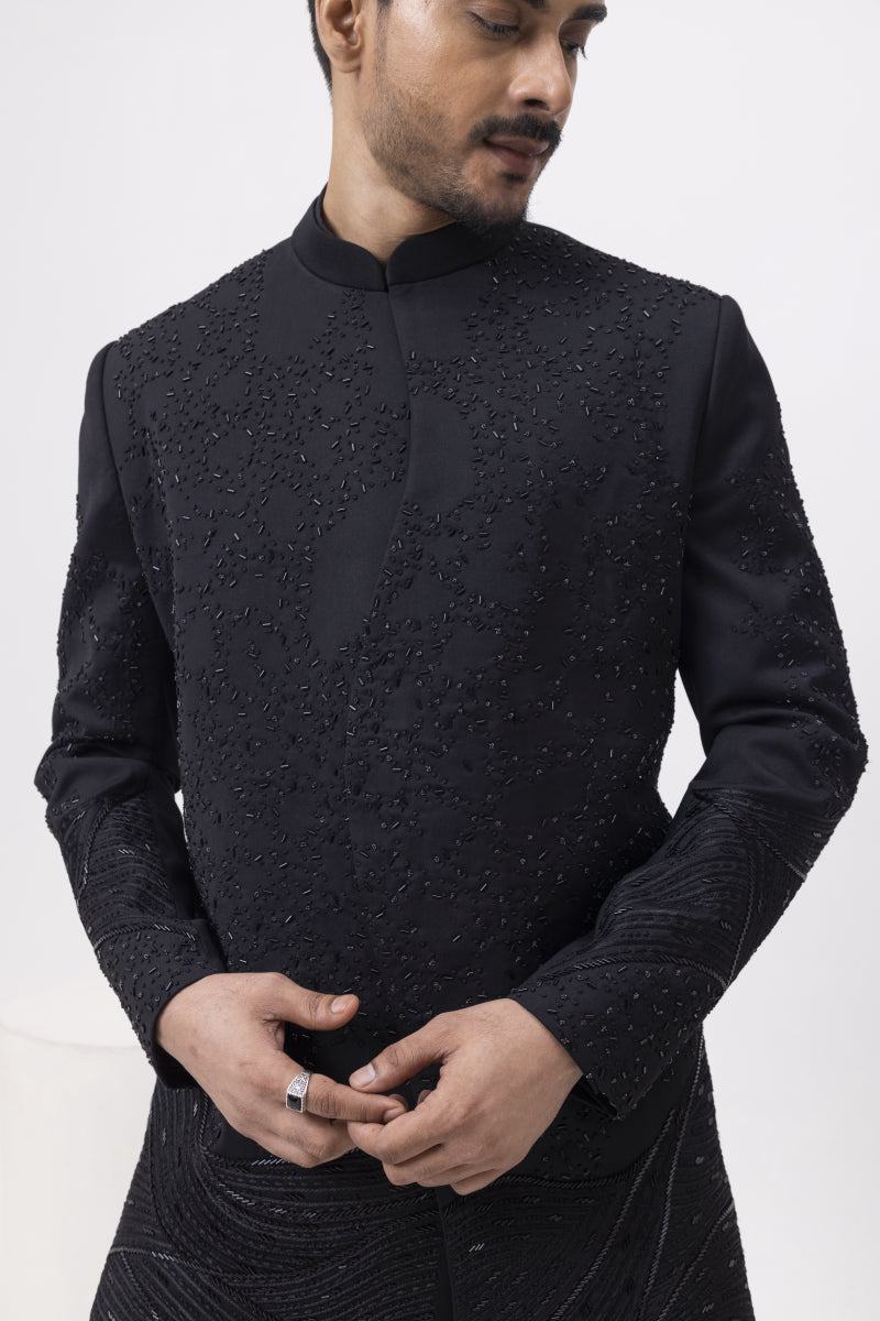 A twilight canvas scattered with beads like constellations, this black bandhgala set with trousers is where sharp tailoring meets cosmic romance. Perfect for grooms or groomsmen seeking quiet drama, this piece commands the room without raising its voice.