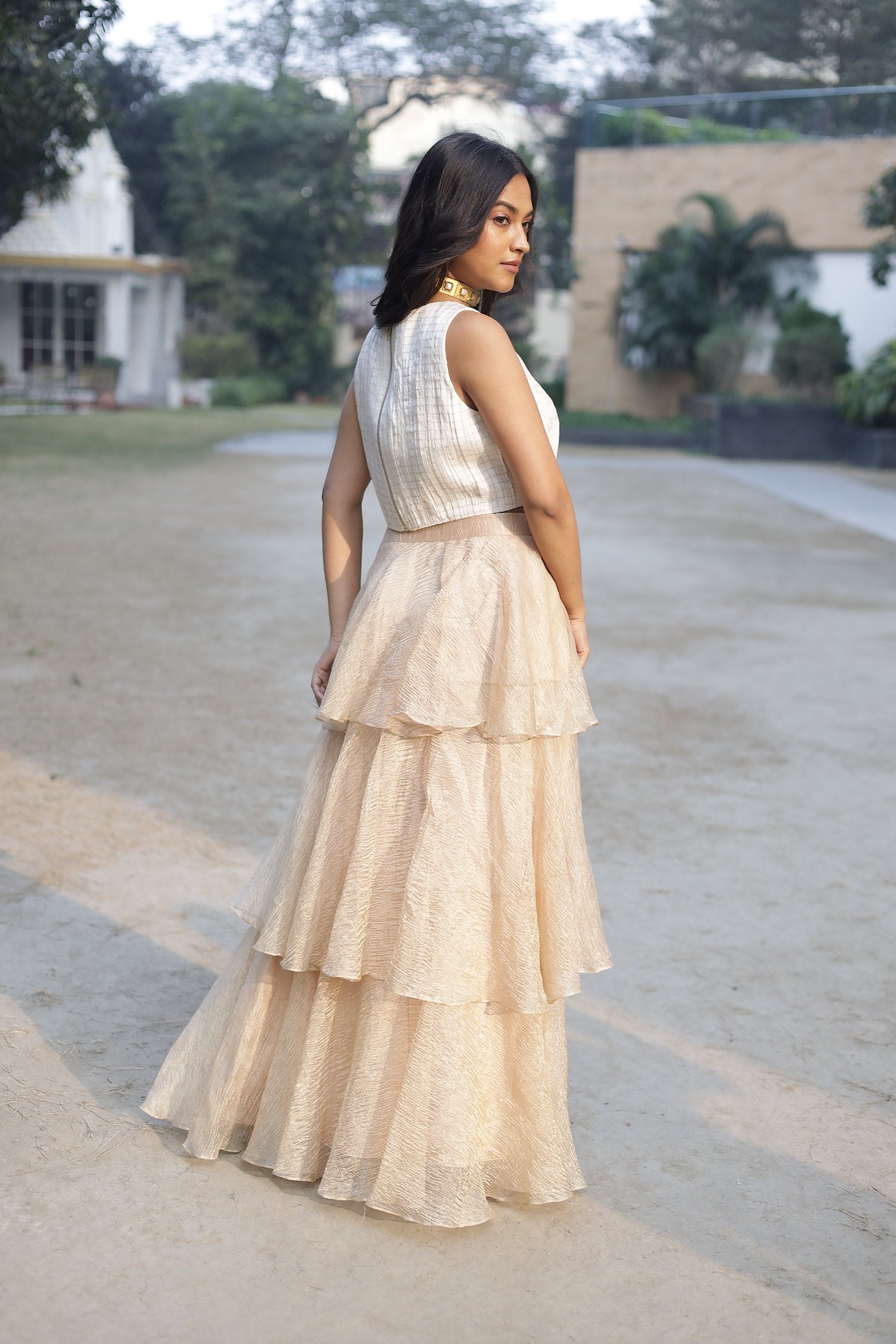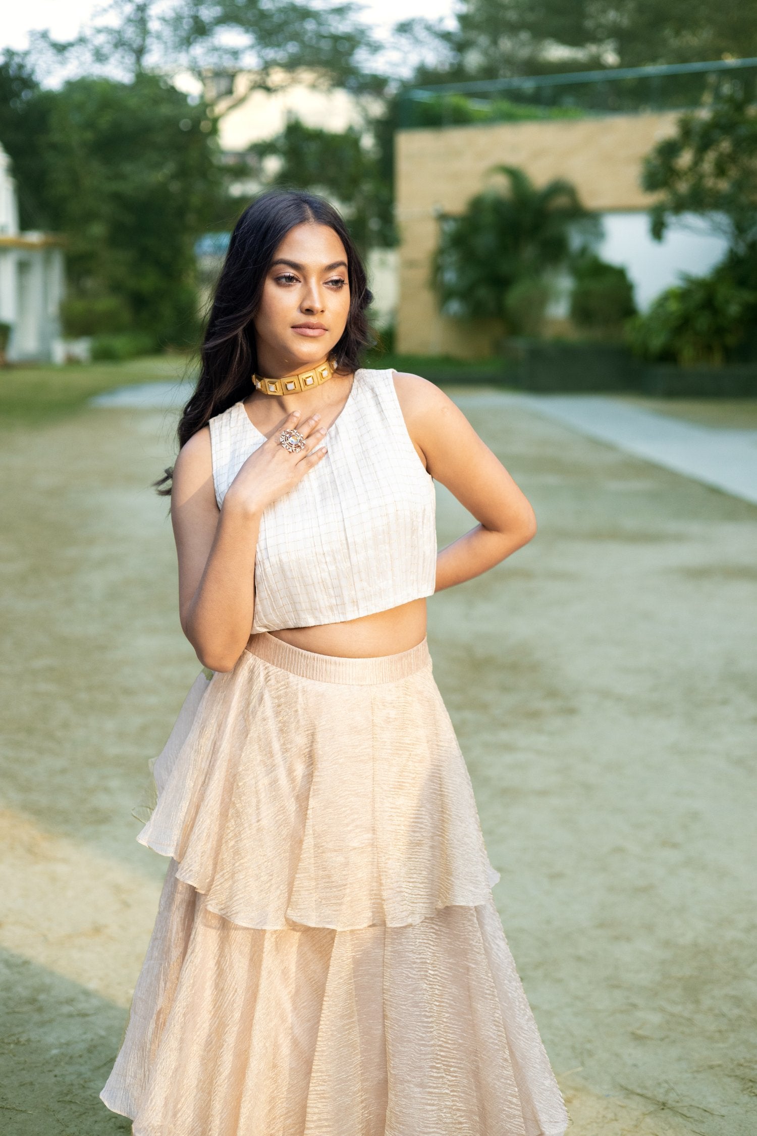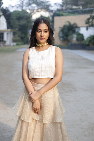 The Saaj Top exudes elegance with its white gold design. Its versatility makes it the perfect addition to any bottom, elevating any look to new levels of sophistication. Make a statement with this sleek and stylish top.