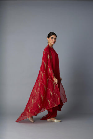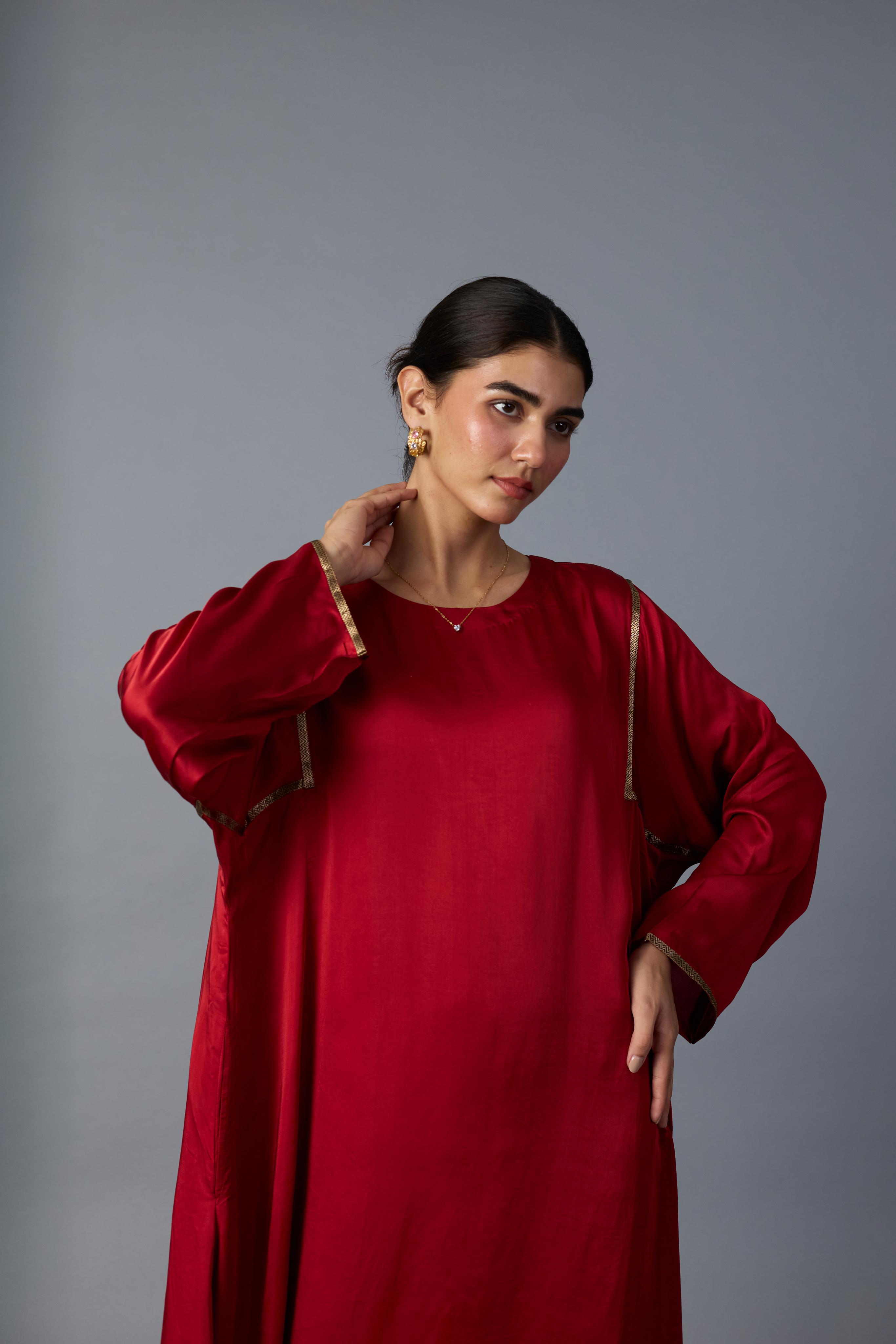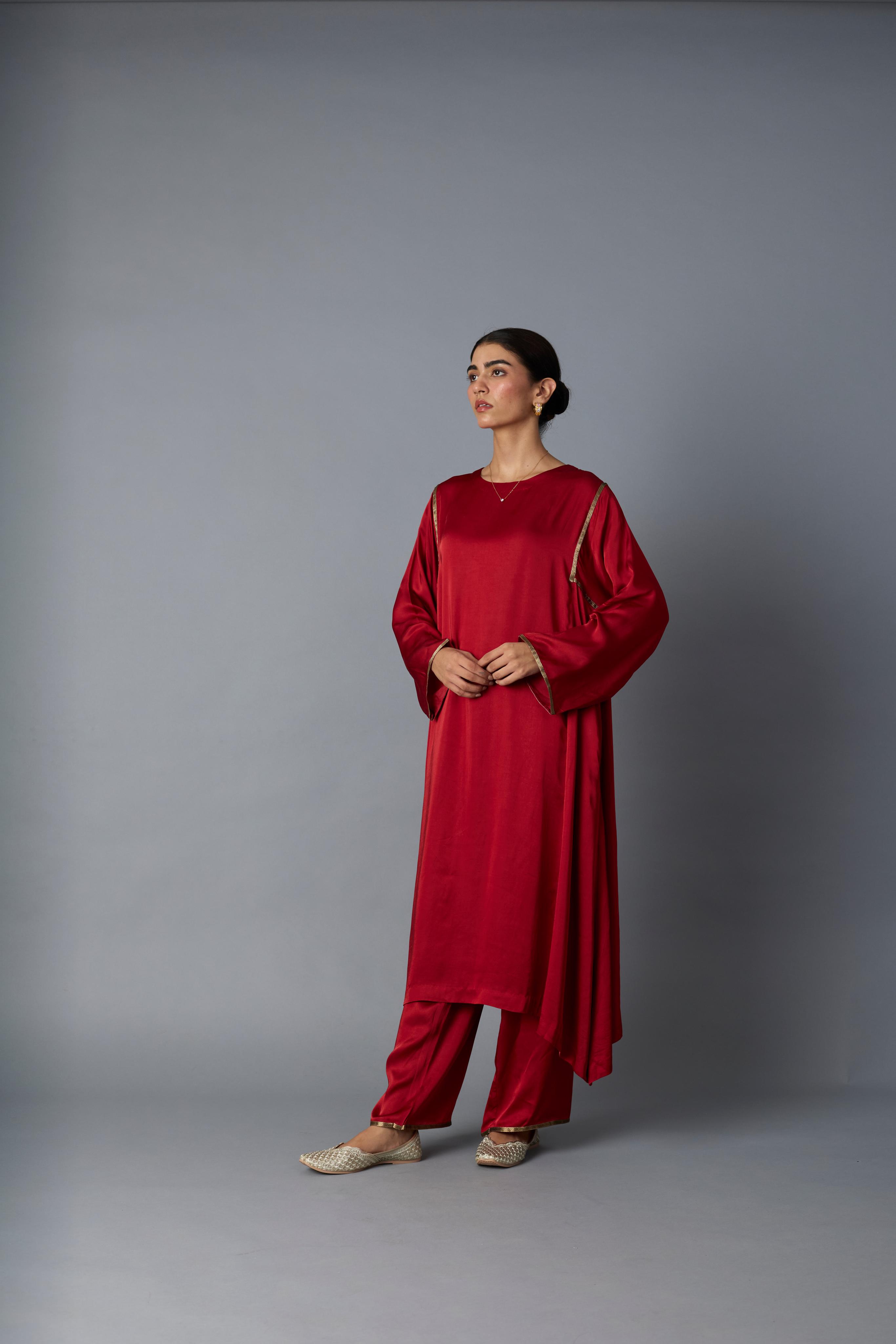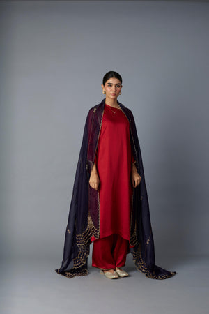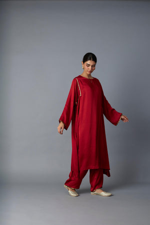 The Sabah Kalidar kurta set in deep red modal satin showcases exquisite zari detailing, combining elegance with comfort. This refined 2-piece outfit pairs seamlessly with our zardozi embroidered Sama or Firoza organza dupatta, enhancing its traditional charm and intricate craftsmanship. Perfect for special occasions, it delivers a sophisticated and timeless appeal.