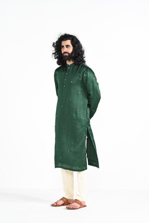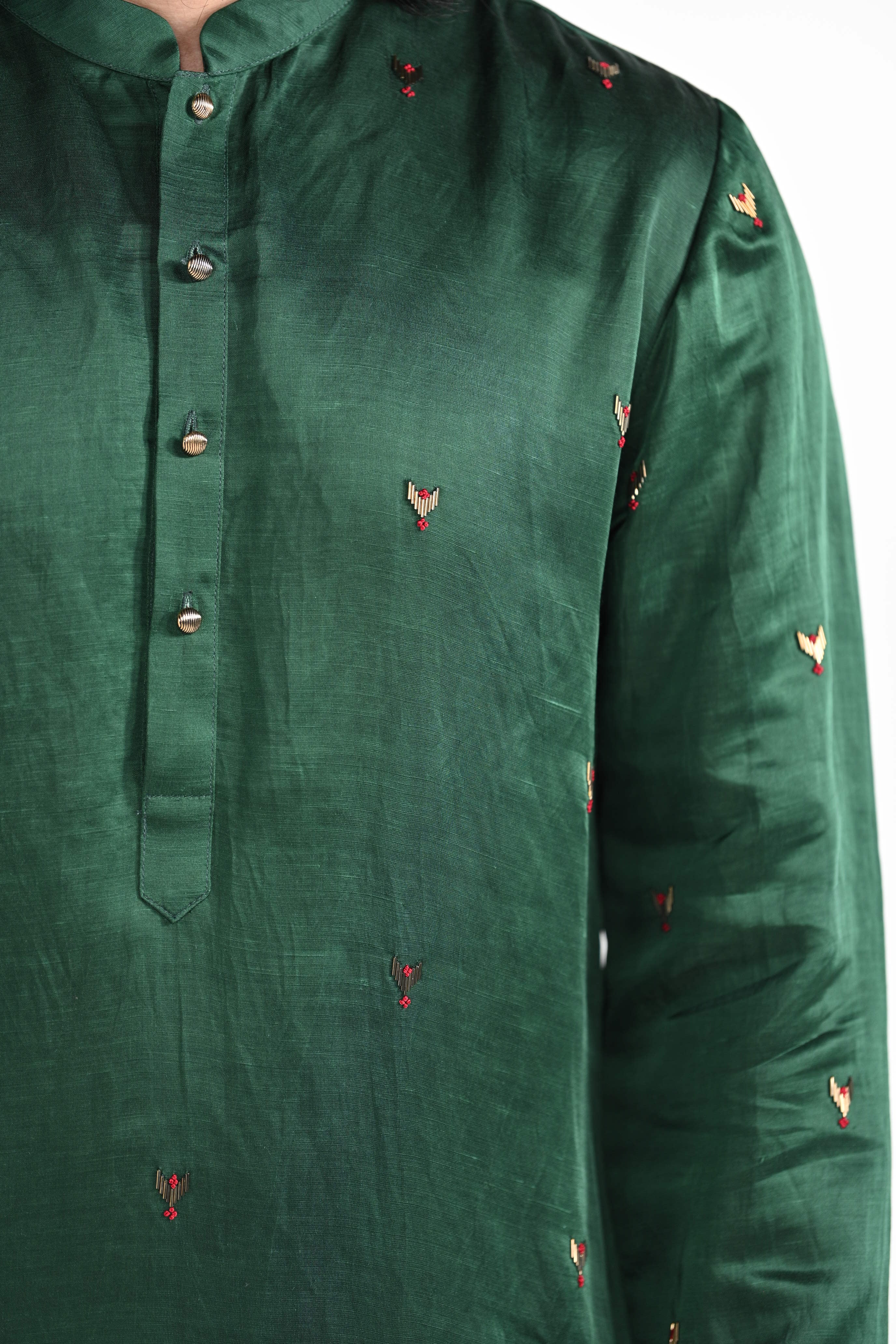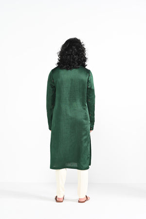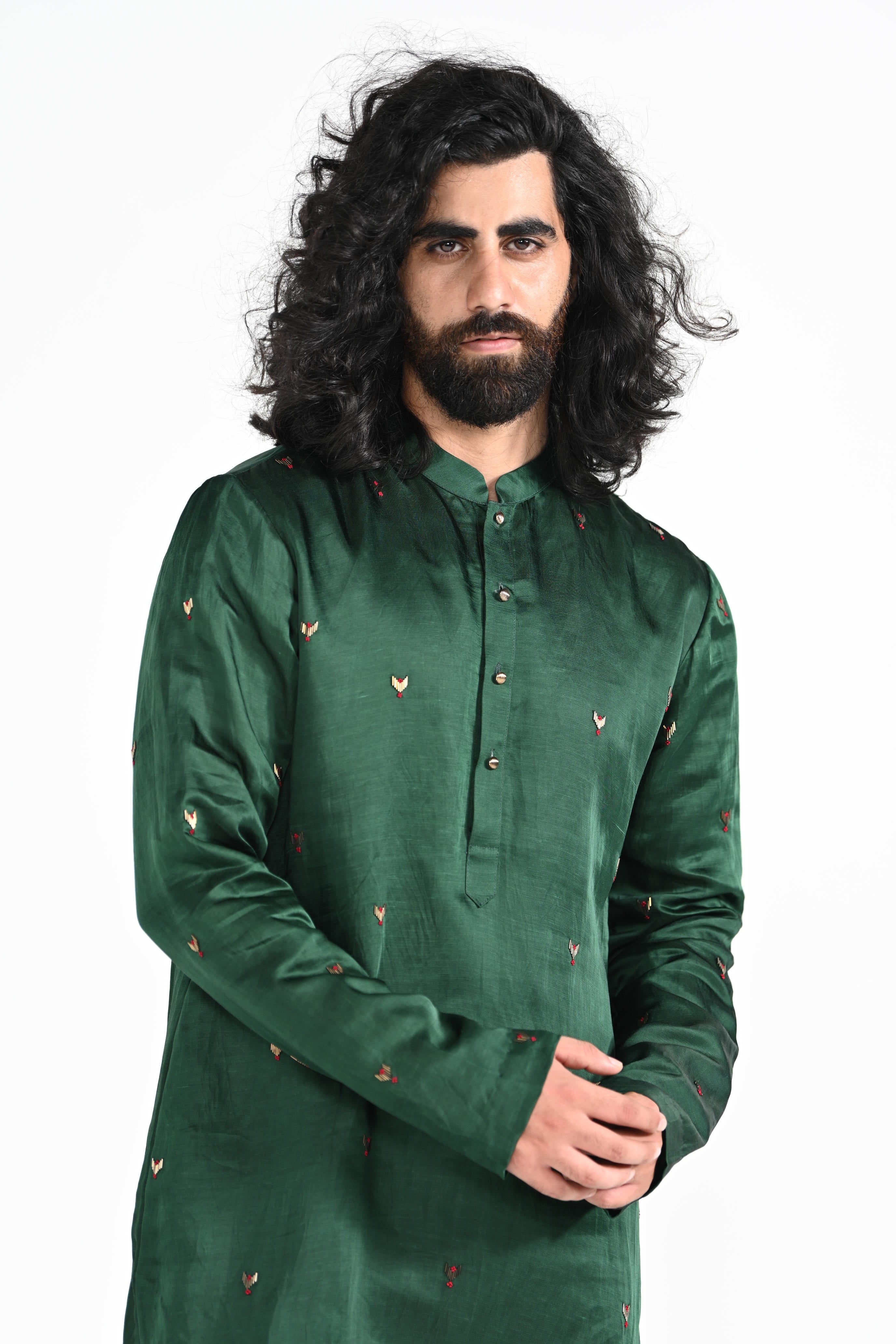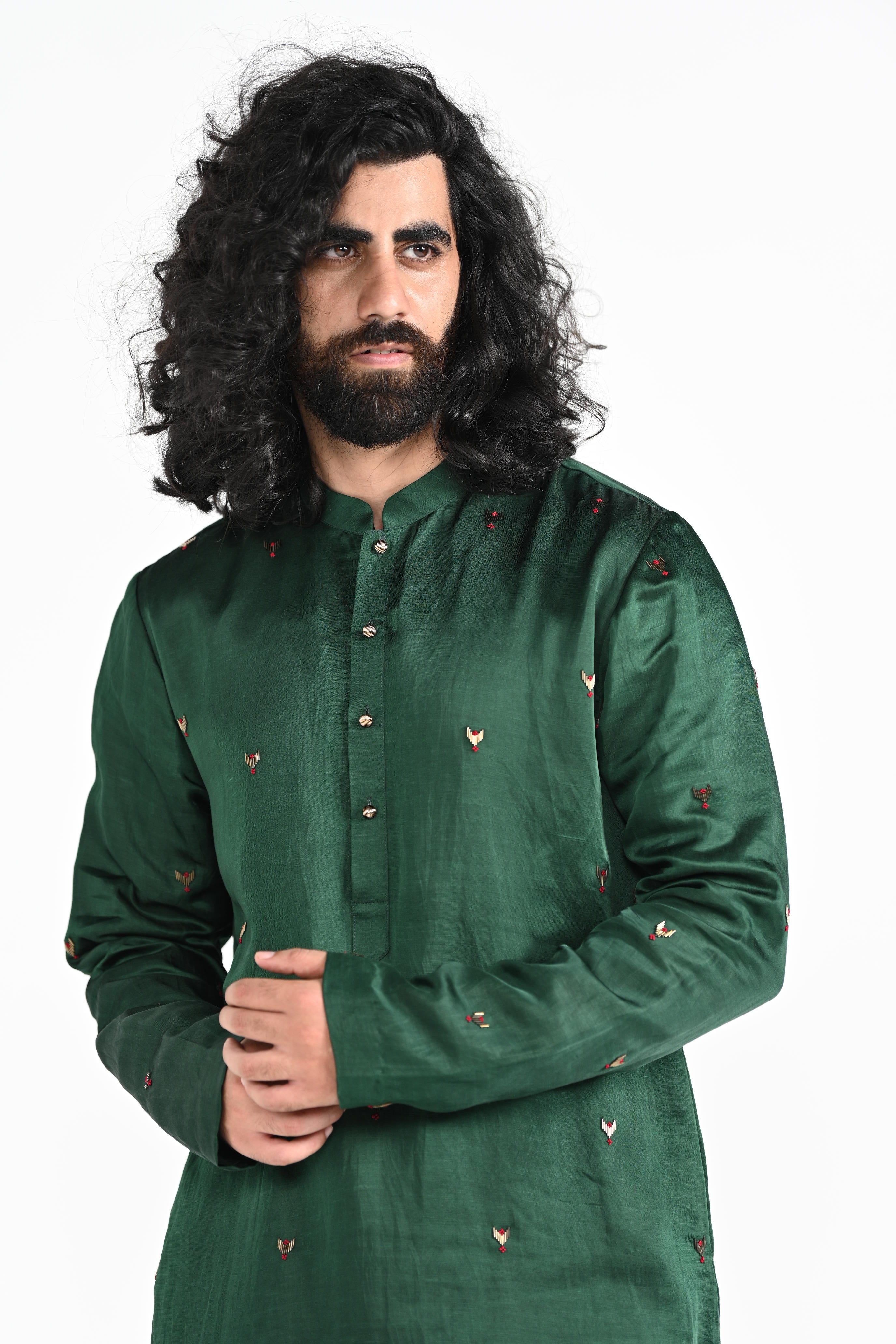 Sacramento Green thread and cutdana work embroidered on linen satin.Paired with Buttercream slim fit Pant Pajama. Color of the actual garment may vary due to lighting conditions during the shoot .