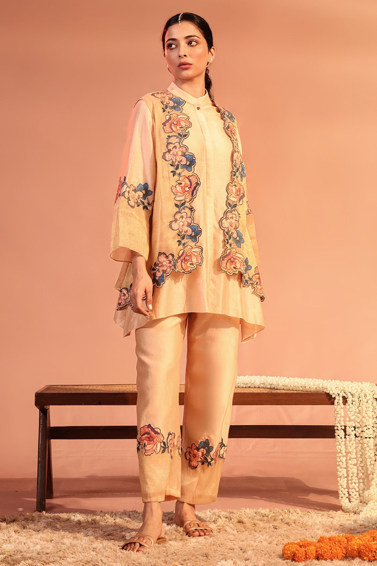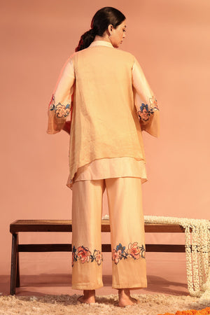 Pink Sadira appliquéd tissue jacket with cutwork border, paired with a shirt and pants featuring embellished borders in chanderi.