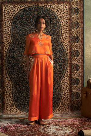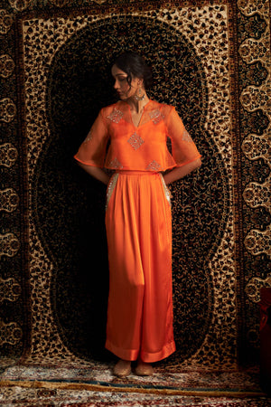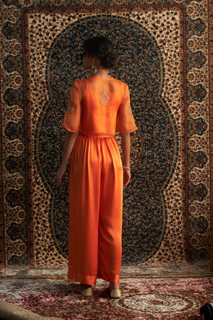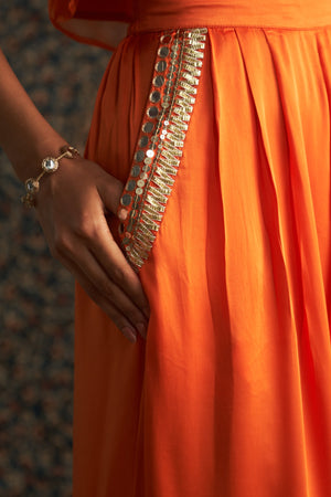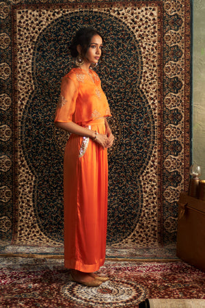 This saffron embroidered sheer top, crafted in luxurious organza, is a standout choice for any occasion. Paired with a sleeveless slip and flowy satin trousers with gota-highlighted pockets, this ensemble seamlessly blends traditional craftsmanship with modern elegance. Perfect for formal events or special celebrations, it ensures you dazzle with every step and leave a lasting impression