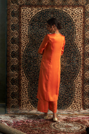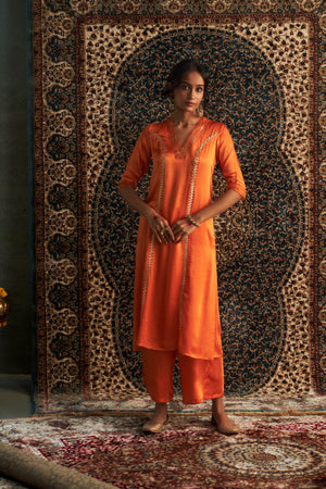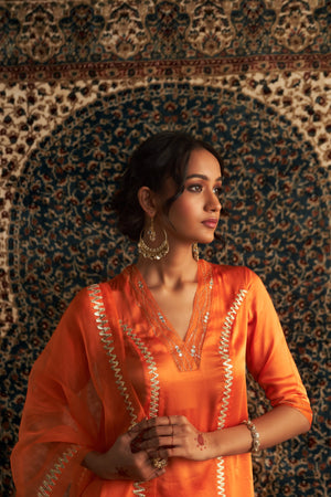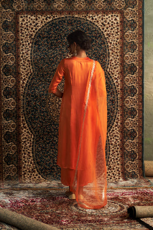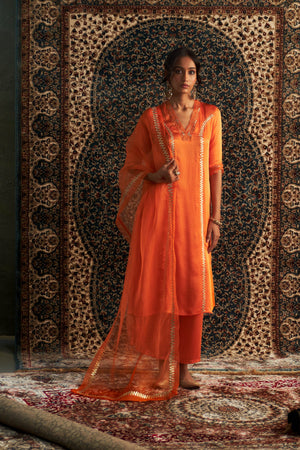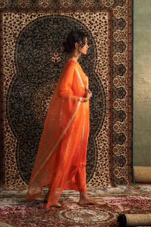 This Saffron Kurta is a stunning fusion of craftsmanship and comfort, offering an elegant blend of tradition and modernity. The delicate organza neckline, adorned with intricate embroidery, elevates the look, while the princess panels with gota detailing create a flattering and relaxed silhouette. The finely embroidered sleeves add a touch of artistry and refinement. Paired with sleek straight pants, this ensemble exudes a chic yet laid-back vibe, perfect for post-ceremony celebrations. The embroidered dupatta adds a timeless, traditional flair, ensuring you stand out with grace and style at any festive occasion