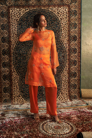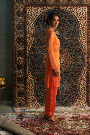 Dazzle in this stunning Saffron organza Kurta paired with sleek, tailored straight trousers. The sheer organza kurta, adorned with intricate zari and dabka motifs, exudes timeless beauty, while the fully embroidered bustier with wave motifs enriched by golden zari work adds a touch of opulence. The vibrant hues and detailed craftsmanship create a mesmerizing look that radiates warmth, joy, and festivity. This ensemble is the perfect choice for festive celebrations, Diwali gatherings, or glamorous cocktail parties.