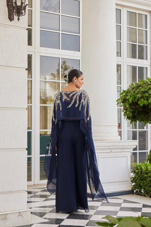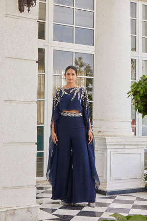 Embellished poncho with embroidered belt palazo and inside plain bralette