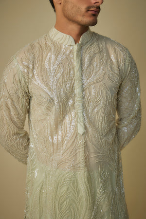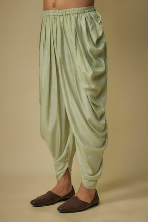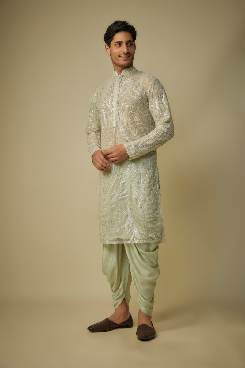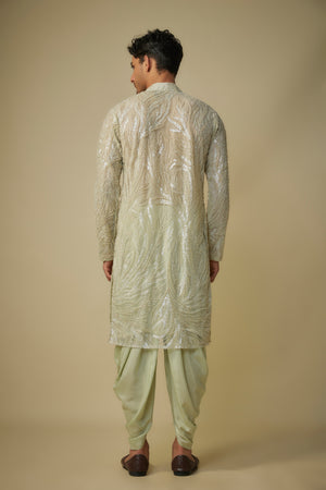 Featuring sage green embroiderd kurta with silky satin dhoti