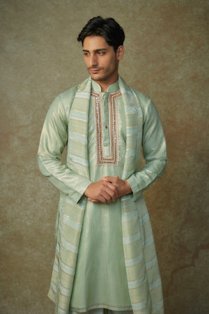 Featuring sage green tissue embroiderd kurta with tissue stripe dhoti and dupatta