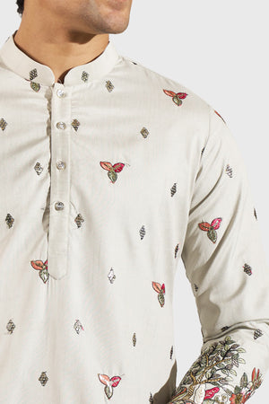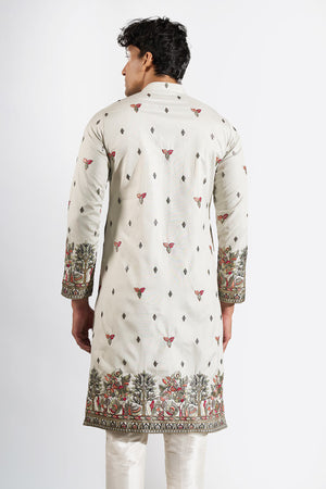Sage Green silk based kurta enhanced with resham and sequins embroidery, paired with an off white dupion silk based pants.