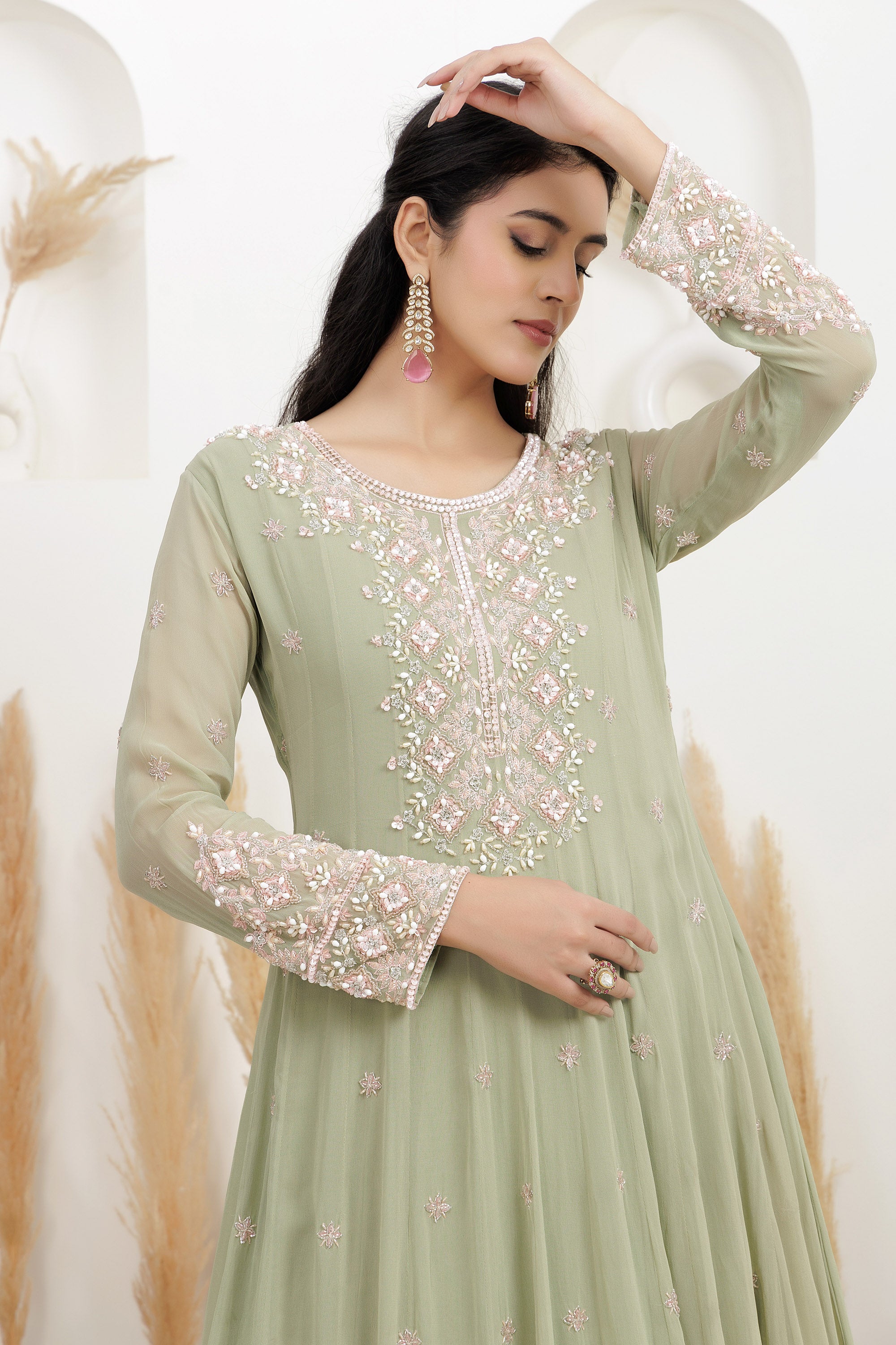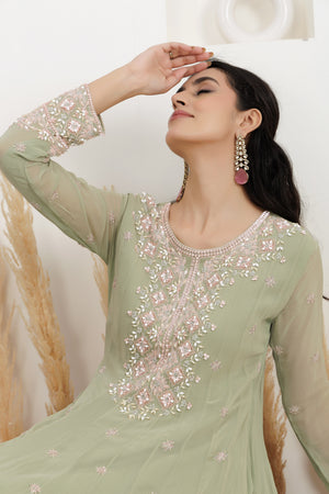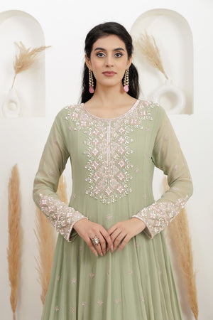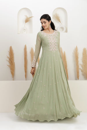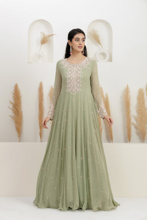 Sage Green Georgette Embroidered Gown.