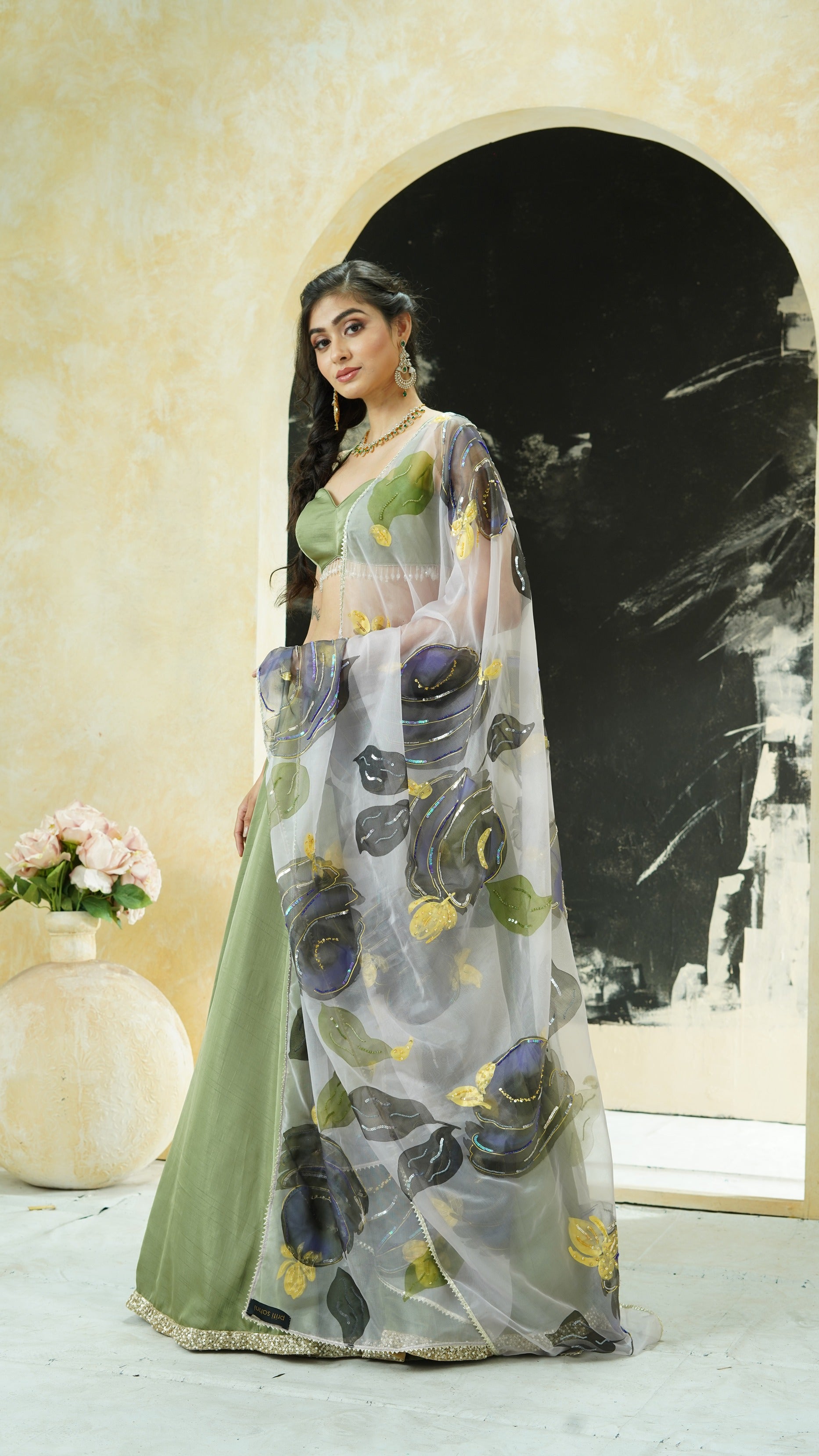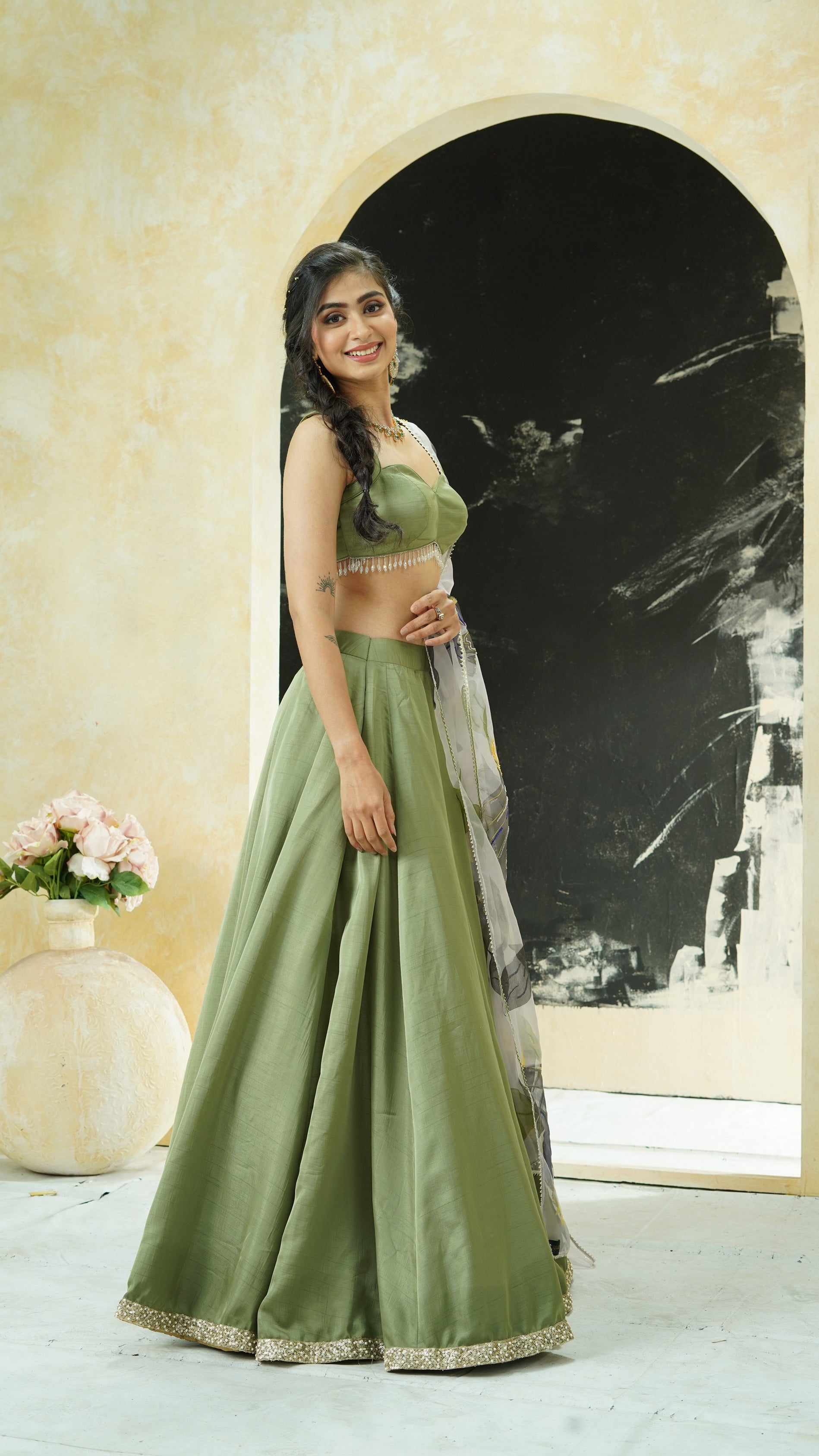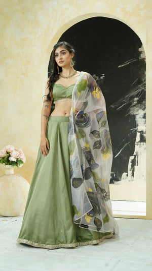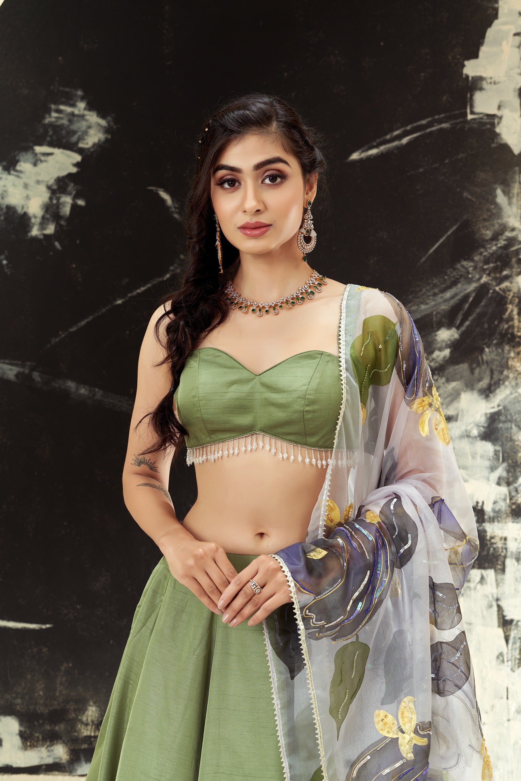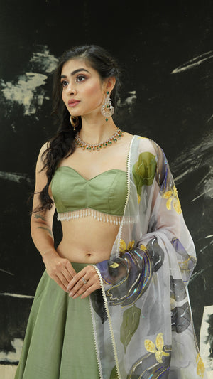 Sage Green silk lehenga set with tassel detailing paired with Mauve hand painted and hand embroidered Organza dupatta.