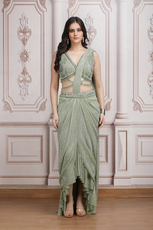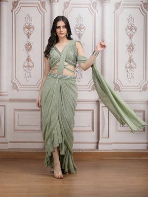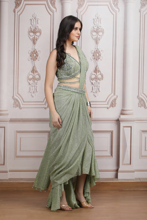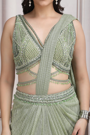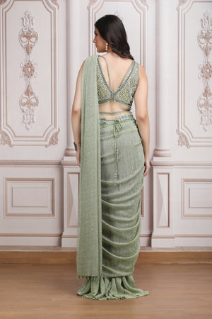 Sage Green Pre- Draped Saree With Embroidered Blouse